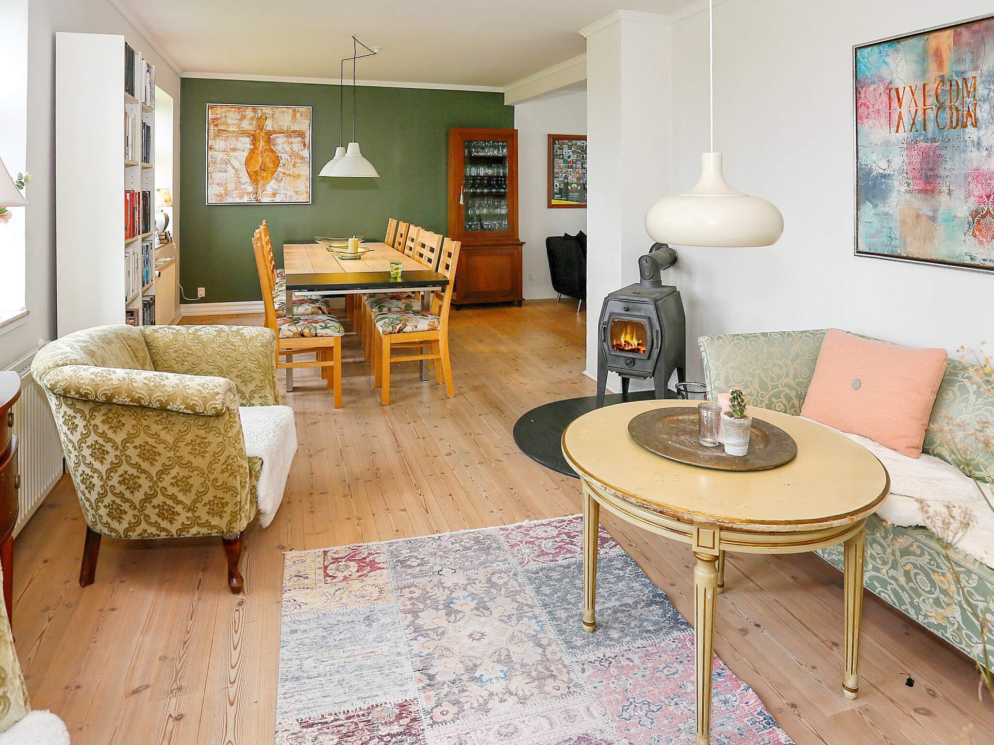 Endvidere mindre badeværelse med brus og toilet. stort lyst køkken med god plads til samvær. I stuen er der brændeovn, hyggekrog, et langt spisebord med plads til 12 personer. Sofagruppen ved Smart Tv’et byder til streaming via netværket.