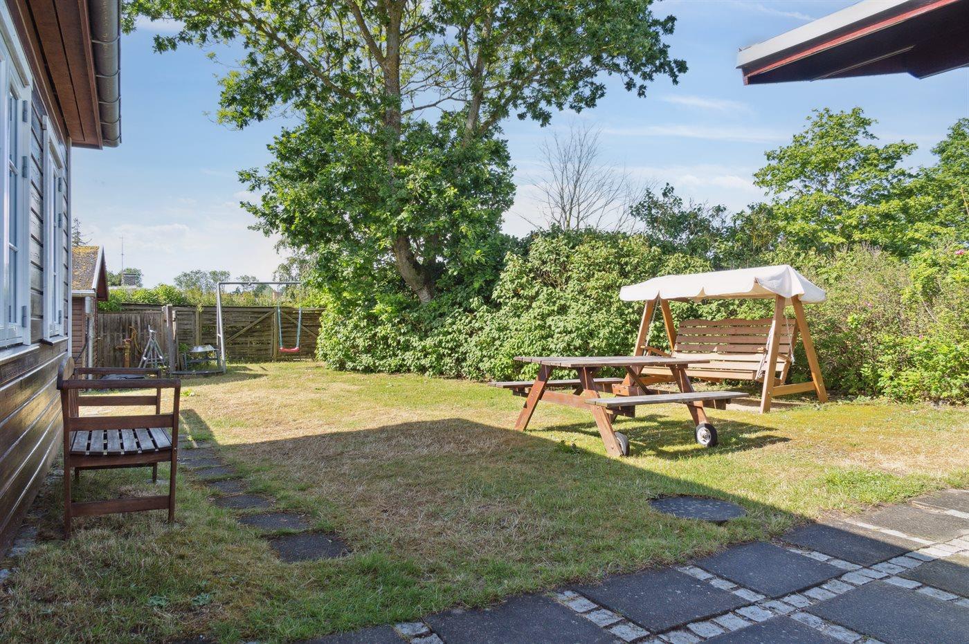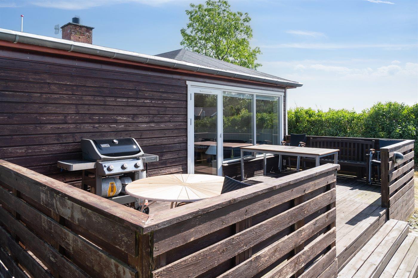 Ferieboligen er beliggende på en 946 m² stor naturgrund. Der er 50 m til havet. Nærmeste forretning er beliggende i en afstand af 3300 m. Til ferieboligen hører åbent terrasseareal. Gynge. Der ligger en legeplads i en afstand af 100 m. Bålsted. Grill til rådighed. Der er installeret stik til opladning af elbil. Med 11 kW ladeeffekt. Parkering ved ferieboligen.