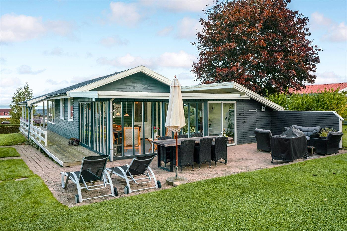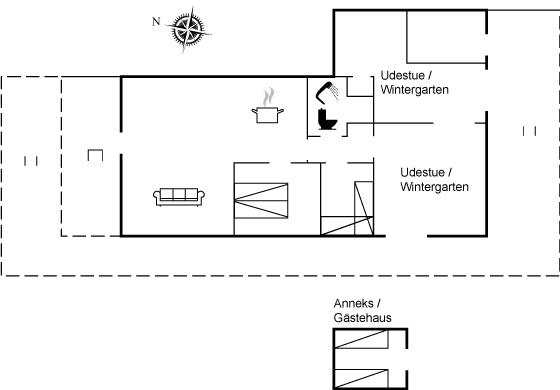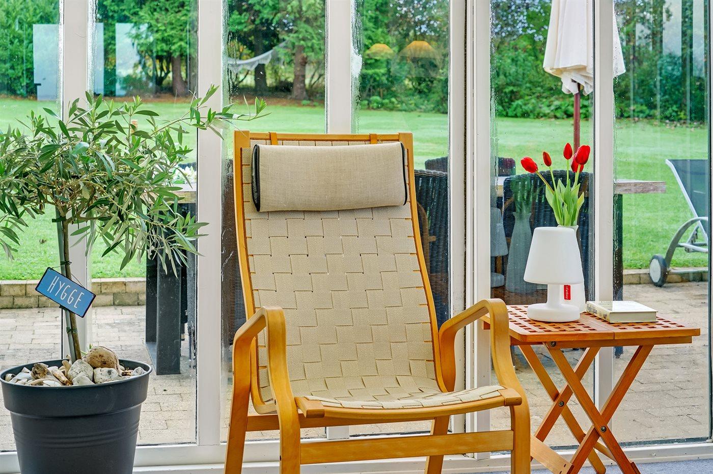 Til huset hører en flot havestue samt en til dels overdækket træterrasse, som går rundt om huset på 3 af dets sider, så det altid er muligt at finde læ, sol eller skygge. Der findes desuden et lille, hyggeligt anneks, som er indrettet med 2 af de i alt 6 sovepladser.