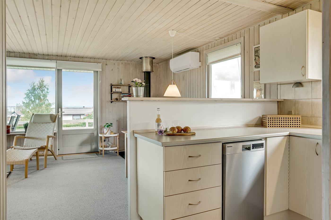 Køkkenet er udstyret med 1 køleskab. Der er 4 elkogeplader, bageovn, mikrobølgeovn samt opvaskemaskine.