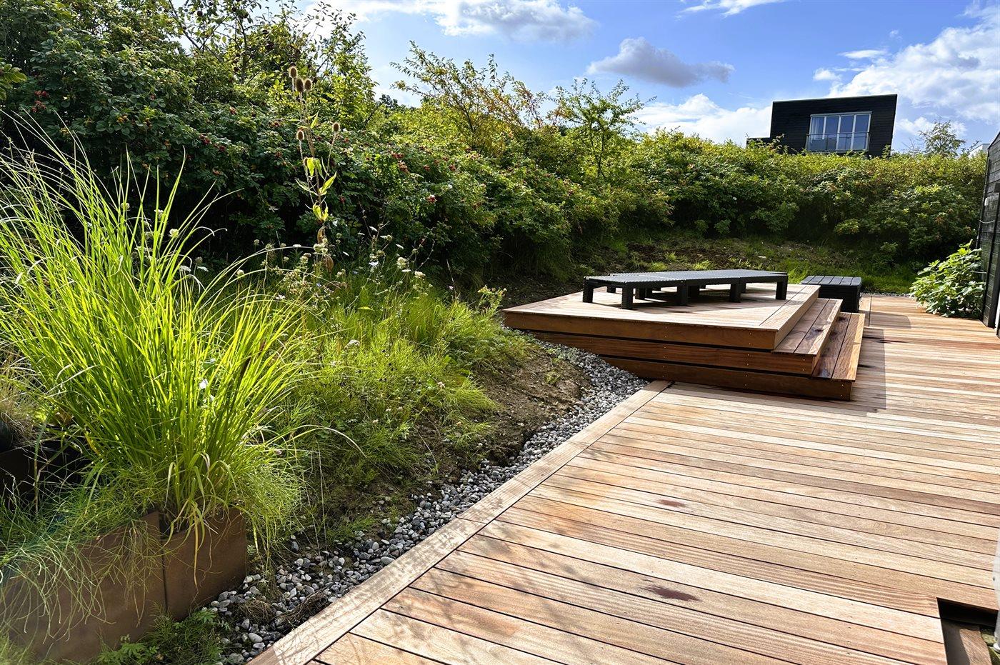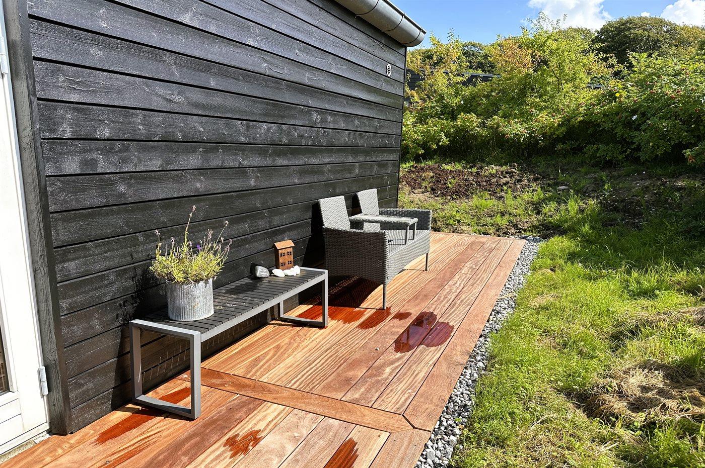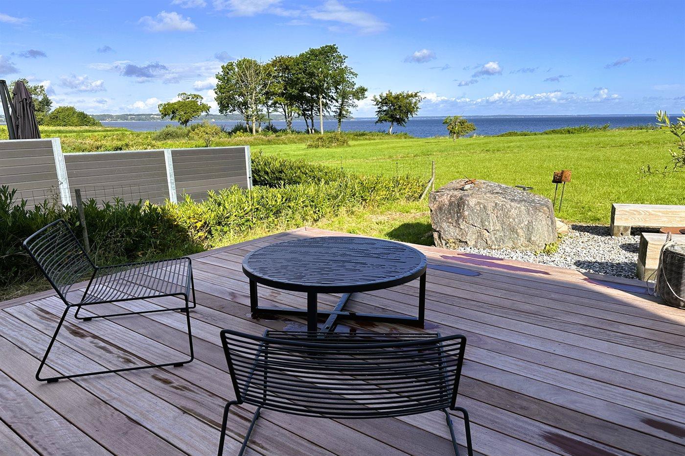 Dejlig stor terrasse foran huset, hvorfra der også er flot havudsigt, og flere terrasser rund om huset, så der altid kan findes både læ og sol.
