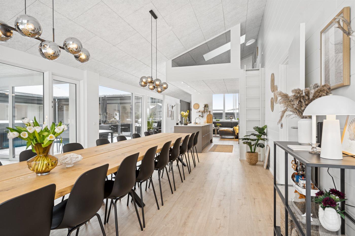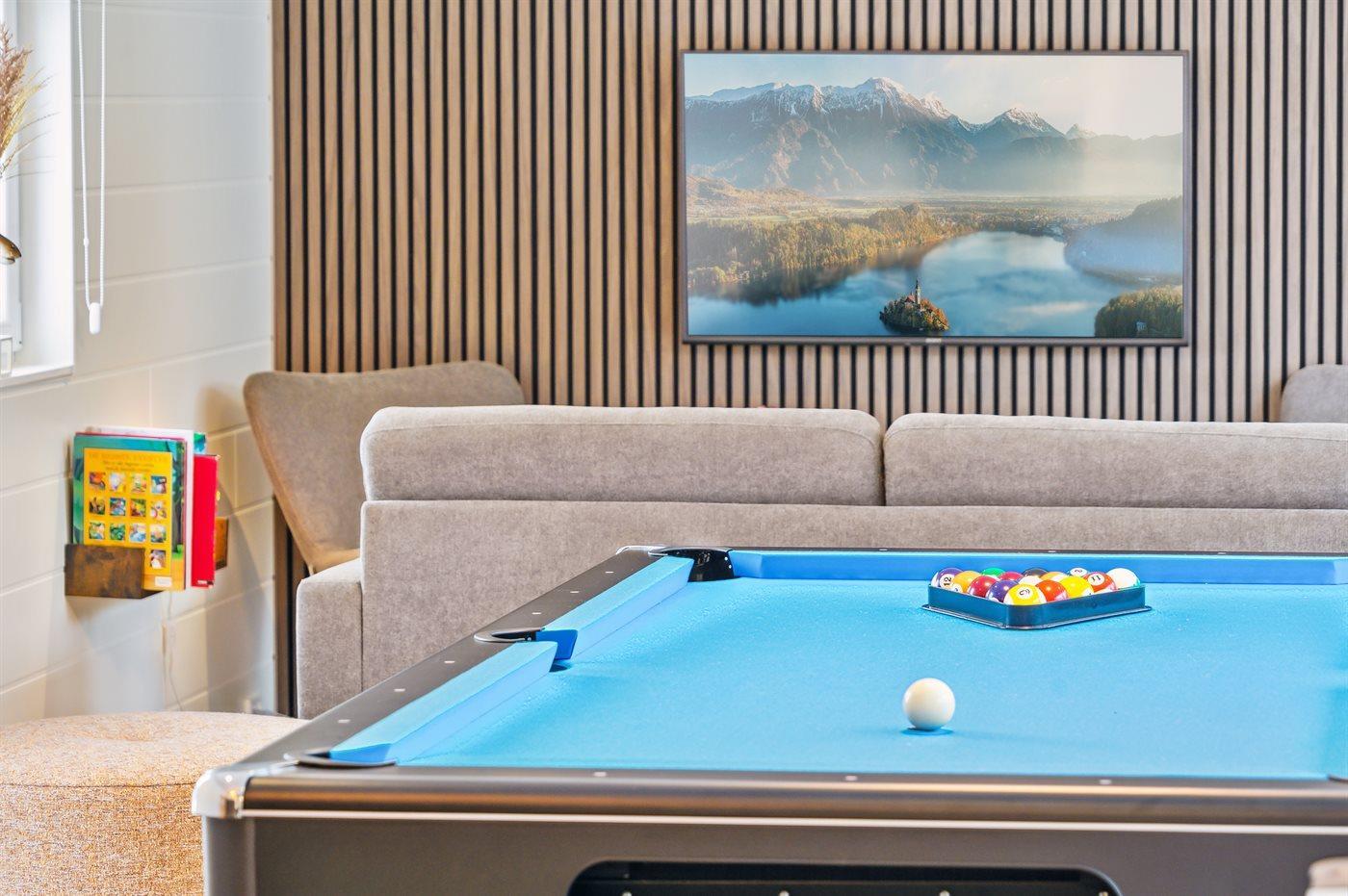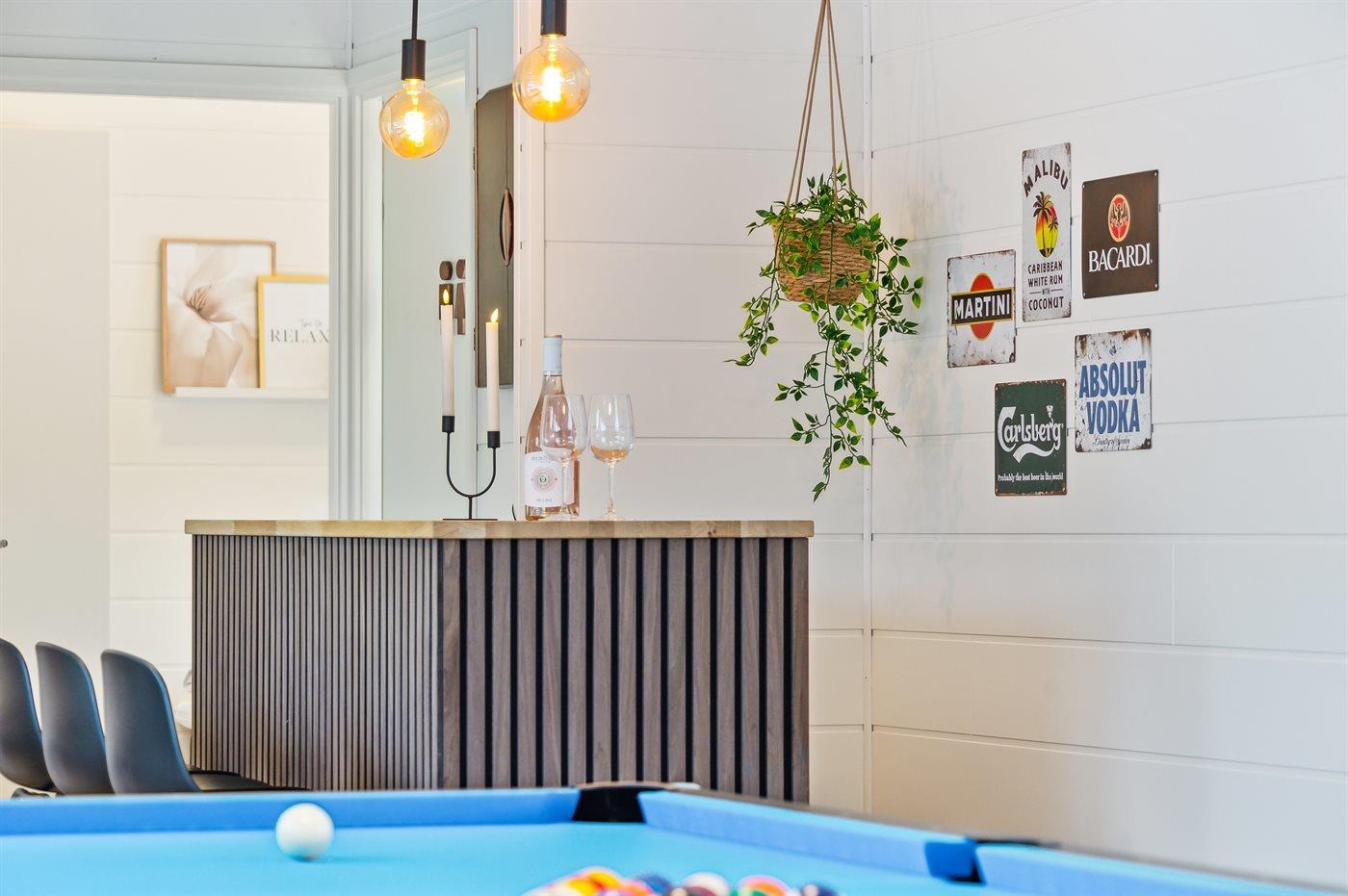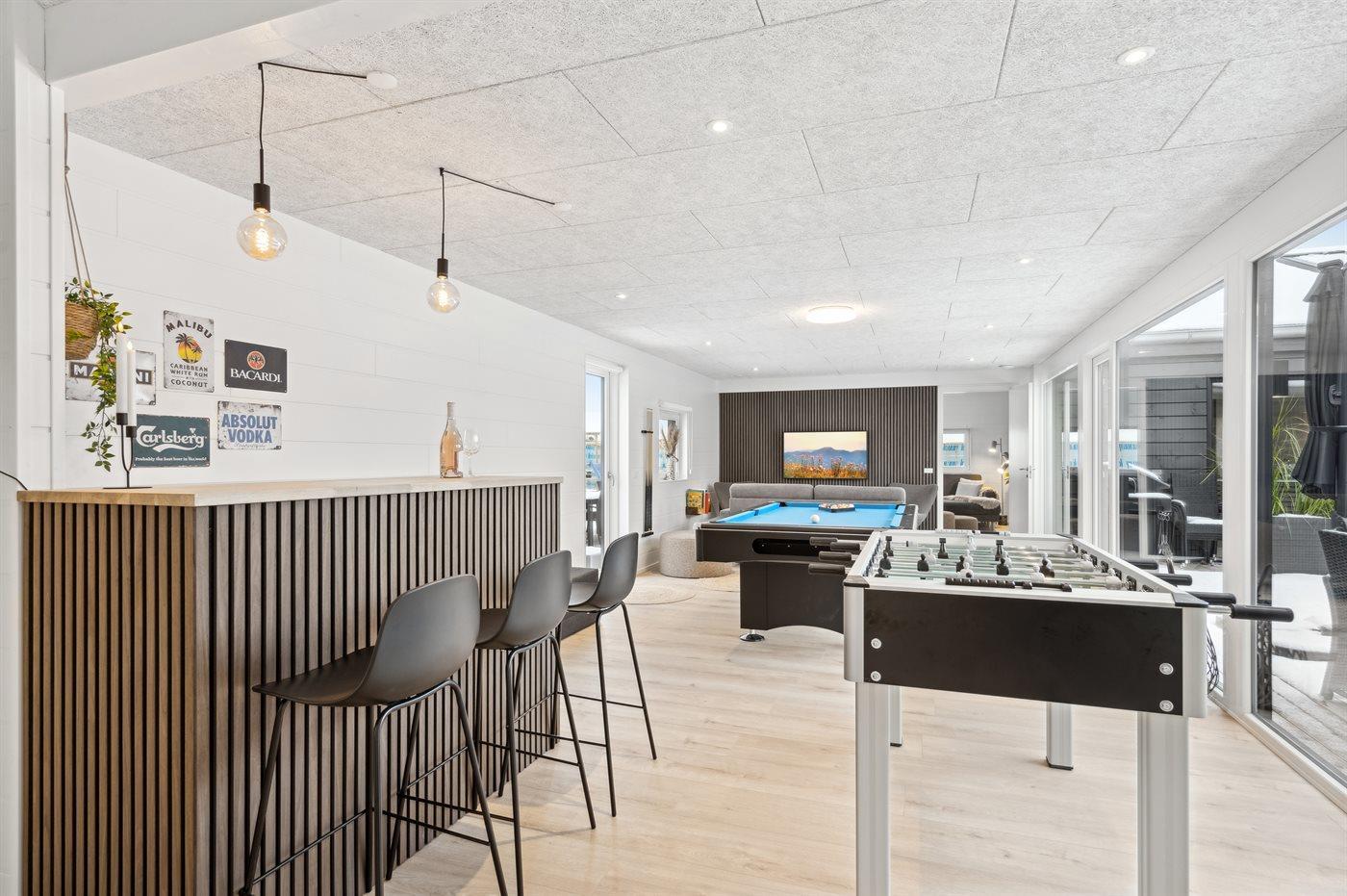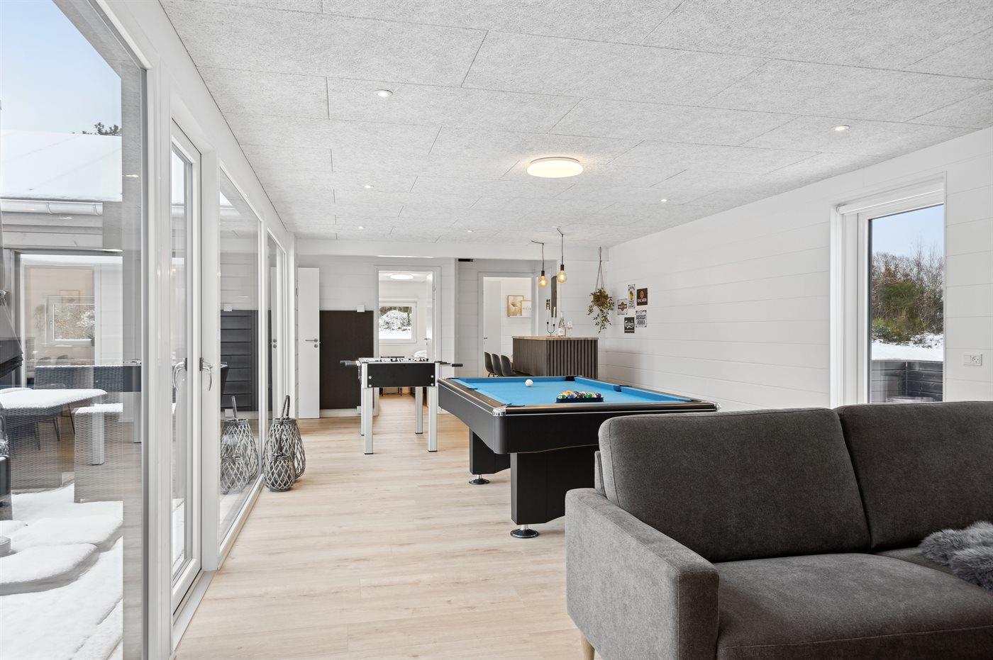 Indendørs venter en række underholdningsmuligheder, herunder aktivitetsrum, poolrum og sauna. Med syv komfortable værelser og rummelige hemse er dette det perfekte sted at samle hele familien til en mindeværdig ferieoplevelse.