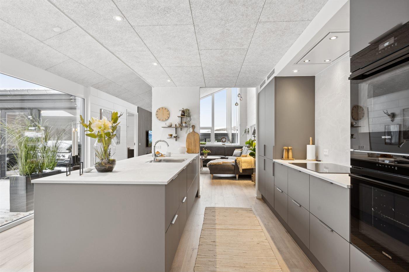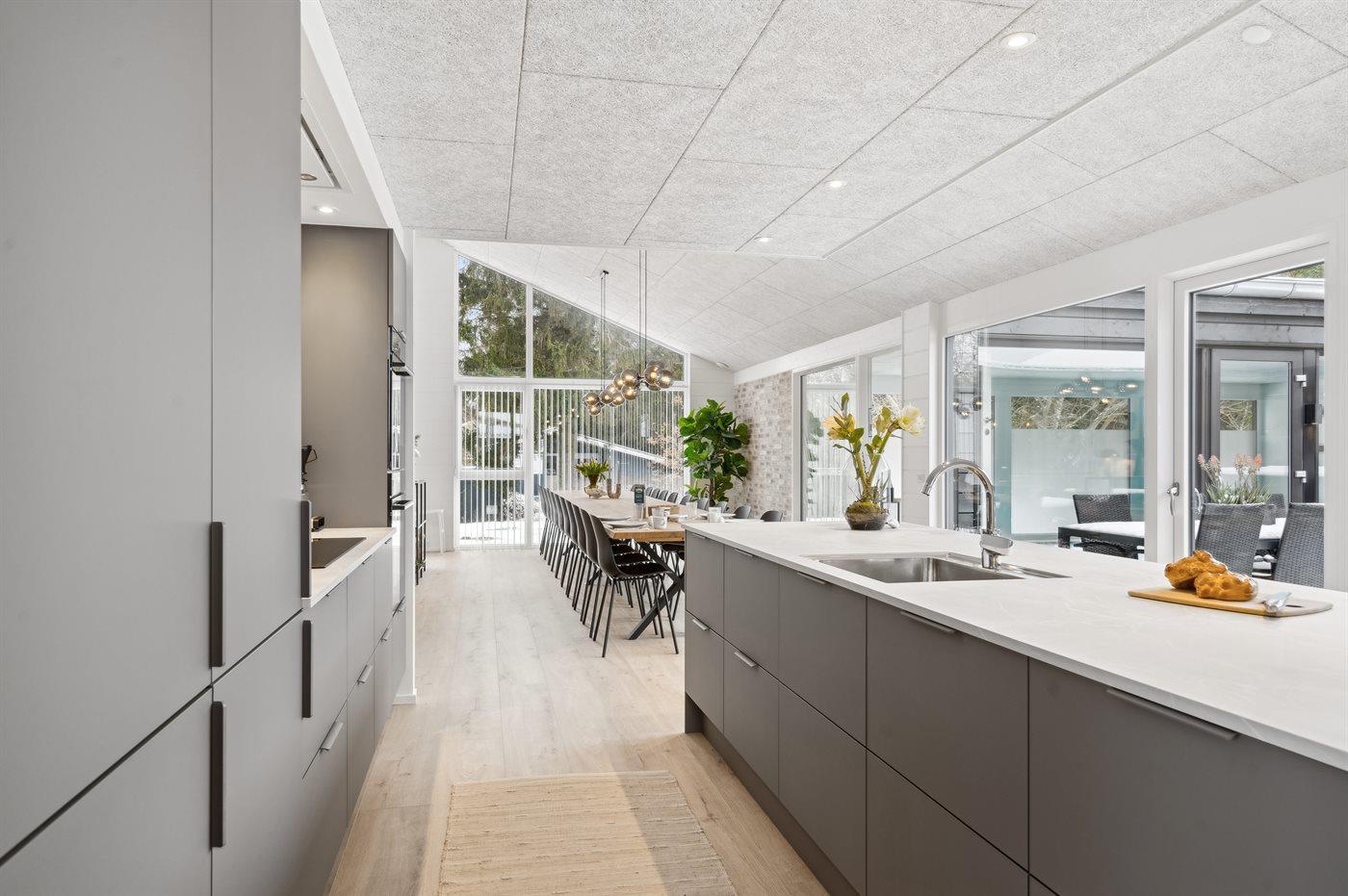 Køkkenet er udstyret med 3 køleskabe. Der er 4 induktionskogeplader, 2 varmluftovne, mikrobølgeovn samt 2 opvaskemaskiner.