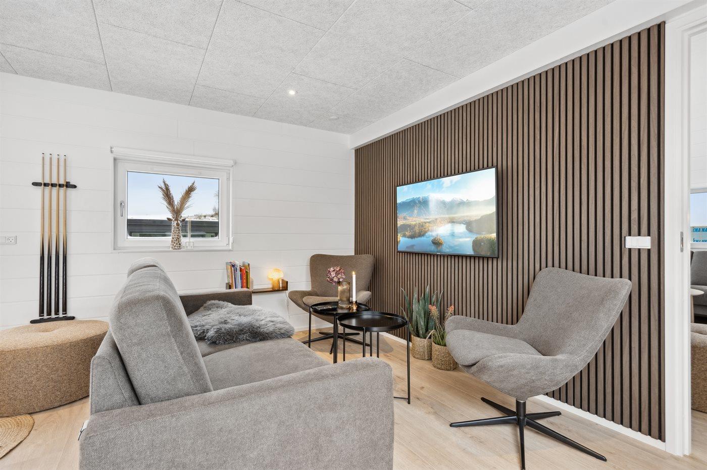 1 Smart-TV. Der er mindst 4 danske kanaler. 1-3 svenske kanaler. 1-3 norske kanaler. Mindst 4 tyske kanaler. 1-3 engelske kanaler. Der er trådløst internet til rådighed.