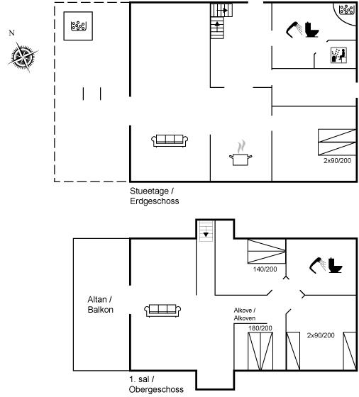 Der er i alt 4 soveværelser. Sovepladserne fordeler sig på: 6 sovepladser i dobbeltsenge. 4 sovepladser i enkeltsenge. 2 sovepladser i alkove.- 4 af disse sovepladser befinder sig på husets hemse. Derudover er der 1 stk. barneseng.