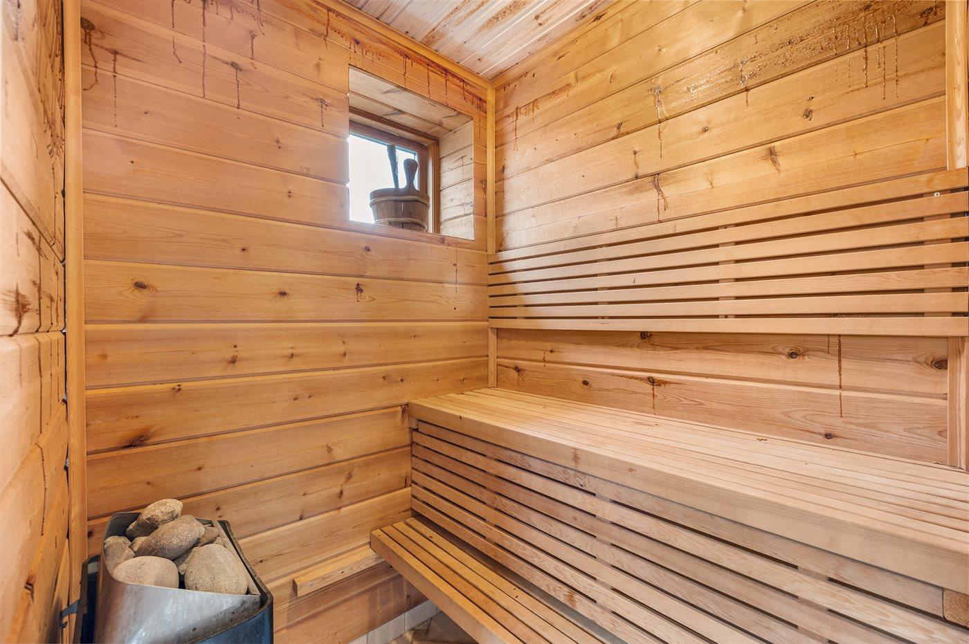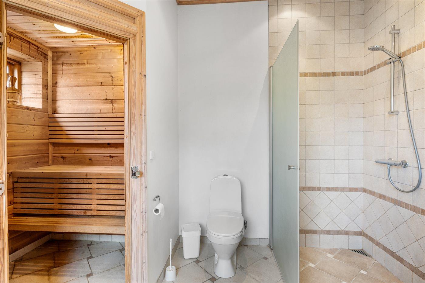 Der er 2 badeværelser med bruseniche og 2 toiletter. Der er gulvvarme på 2 badeværelser. I saunaen er der mulighed for afslapning.