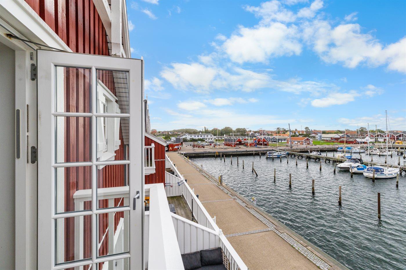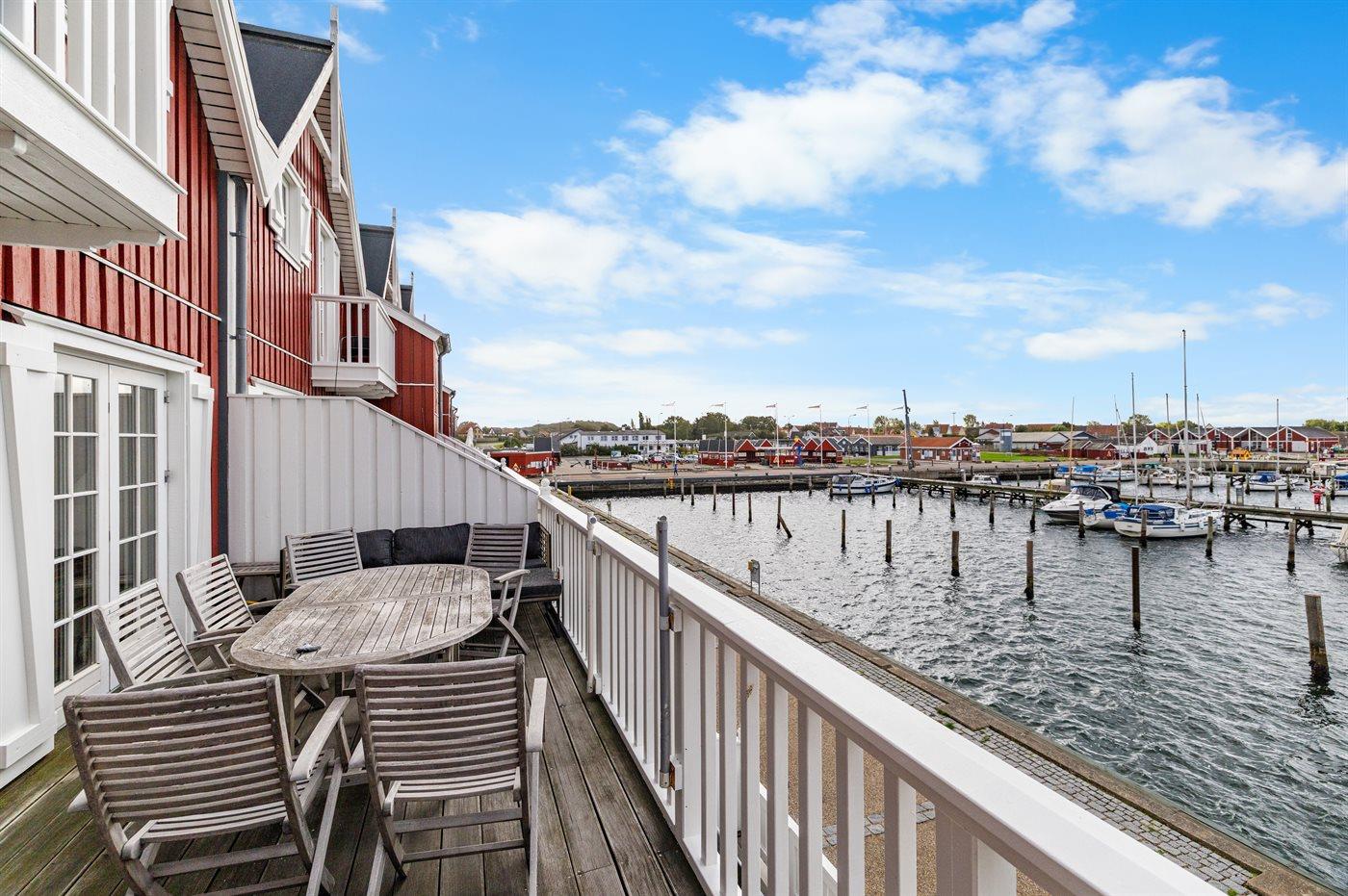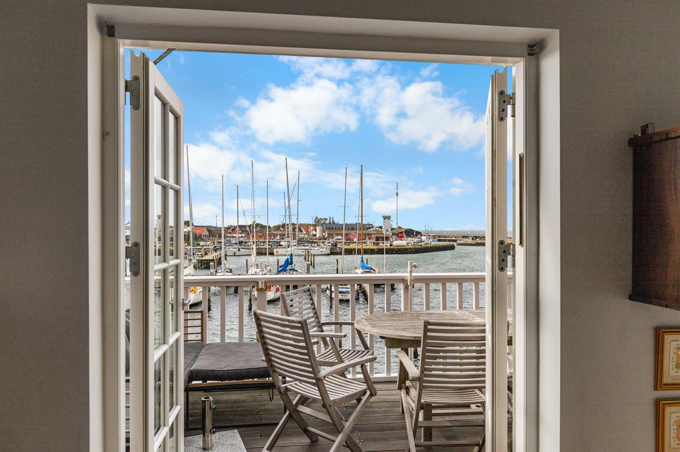 Lejligheden ligger på hhv. 1. og 2. sal og har terrasser på begge sider. Fra den ene side er der udsigt ud over hele marinaen og fra den anden er der udsigt ud over stranden, hvor der er i sommerhalvåret, er opsat badebro.
