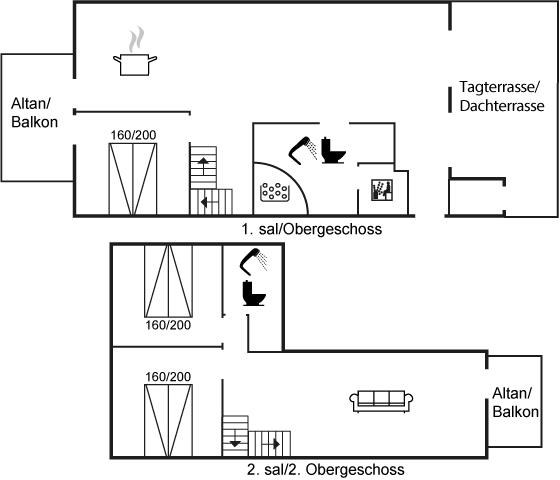 Der er 2 badeværelser med bruseniche og 2 toiletter. Der er gulvvarme på 2 badeværelser. I saunaen er der mulighed for afslapning.