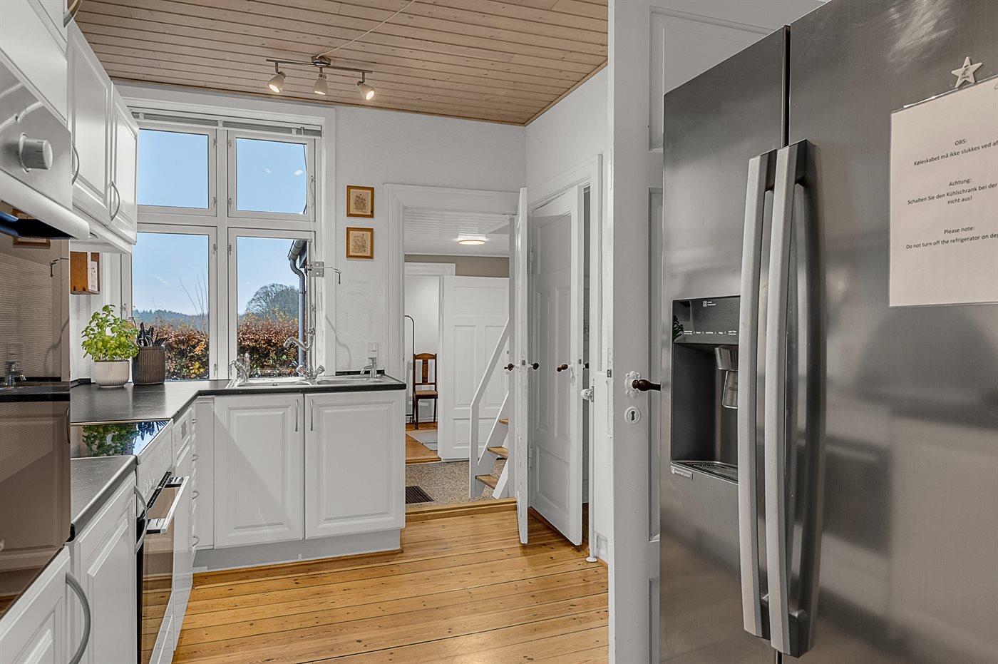 Køkkenet er udstyret med 1 køleskab. Der er 4 keramiske kogeplader, varmluftovn, mikrobølgeovn samt opvaskemaskine.
