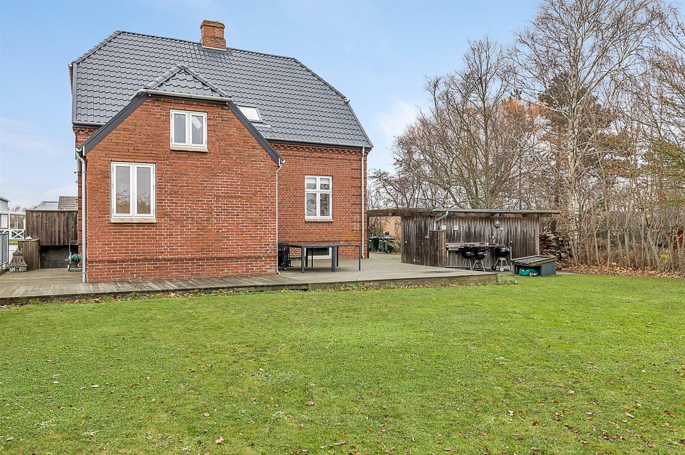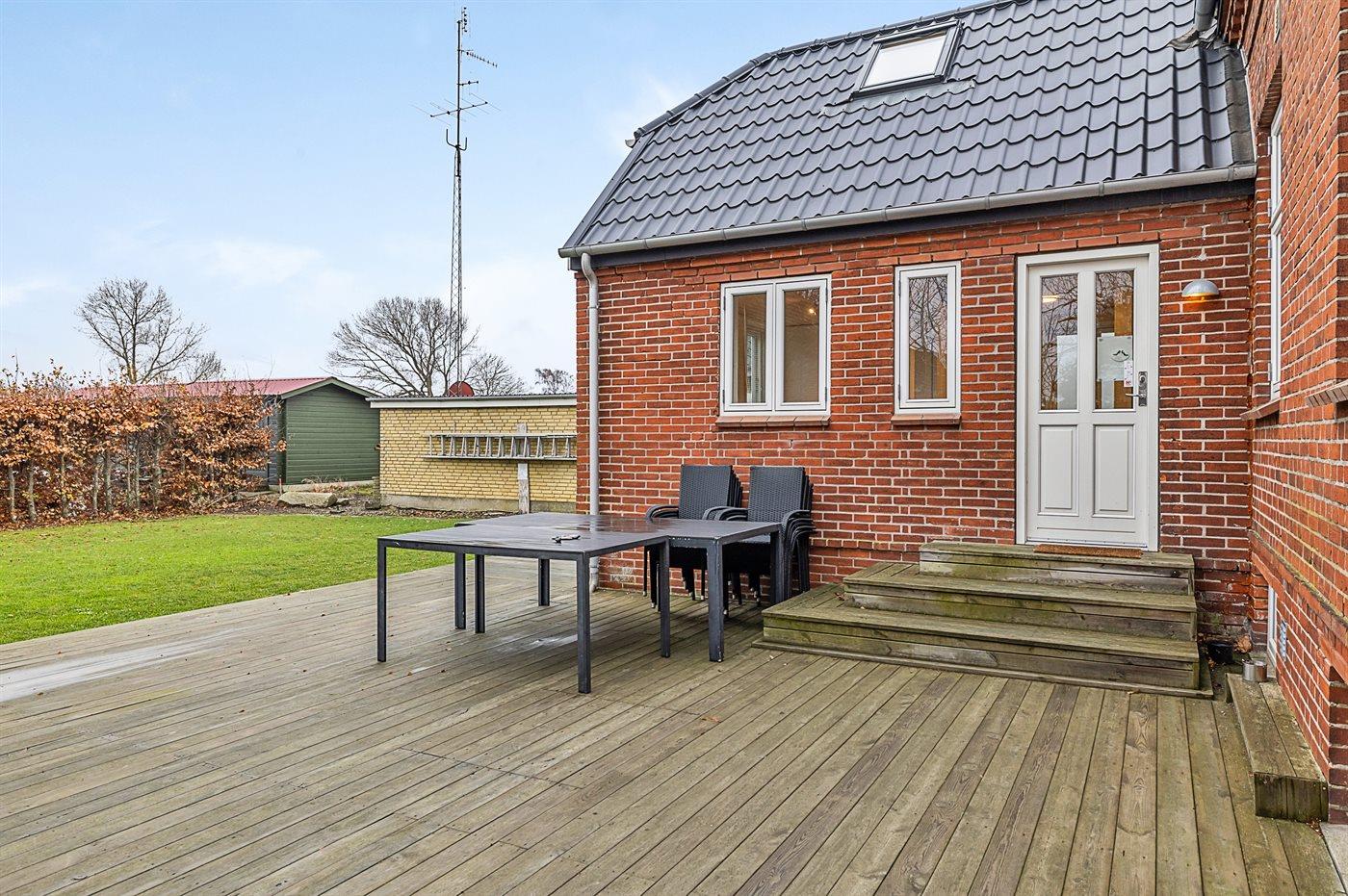 Udenfor er der en stor have med en dejlig terrasse og foran huset findes der et stort areal med plads til flere biler og en dobbelt carport.