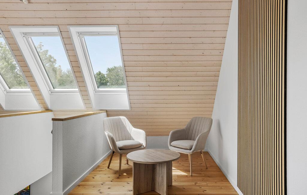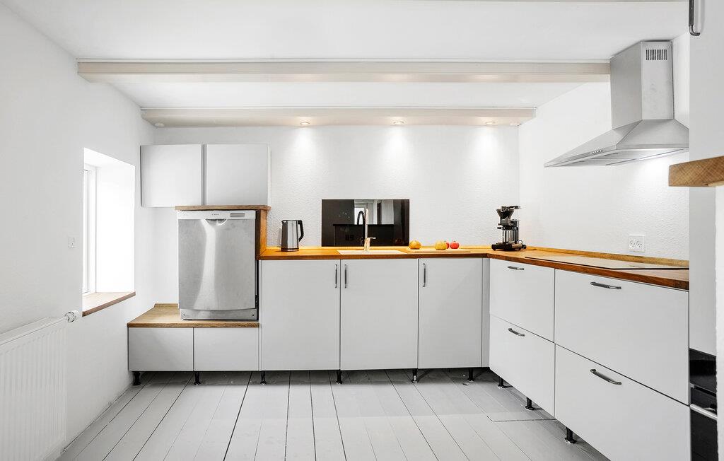 Tilbring en fredfyldt og inspirerende ferie i landlige omgivelser på Langeland, langt fra hverdagens travlhed. Slap af i den lyse opholdsstue med store vinduer, et hyggeligt sofahjørne og en brændeovn. Se en film sammen, nyd udsigten eller læs en god bog. De ekstra siddepladser under taget på øverste etage lægger op til at trække jer tilbage. Lav mad sammen i det elegante køkken. Start med morgenmad ved den lille disk eller spis ved det store spisebord med adgang til terrassen.