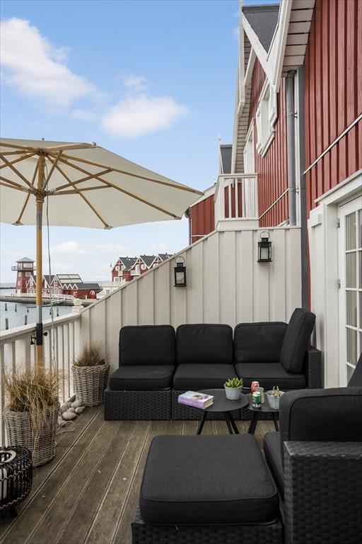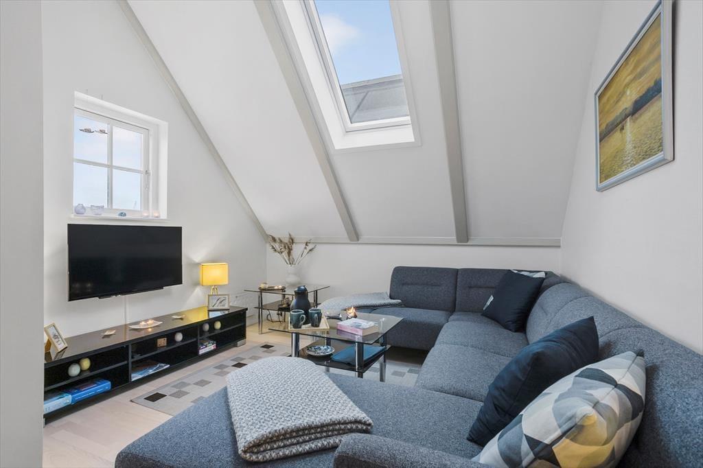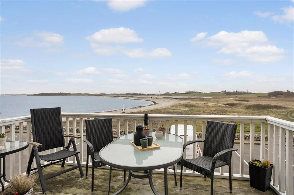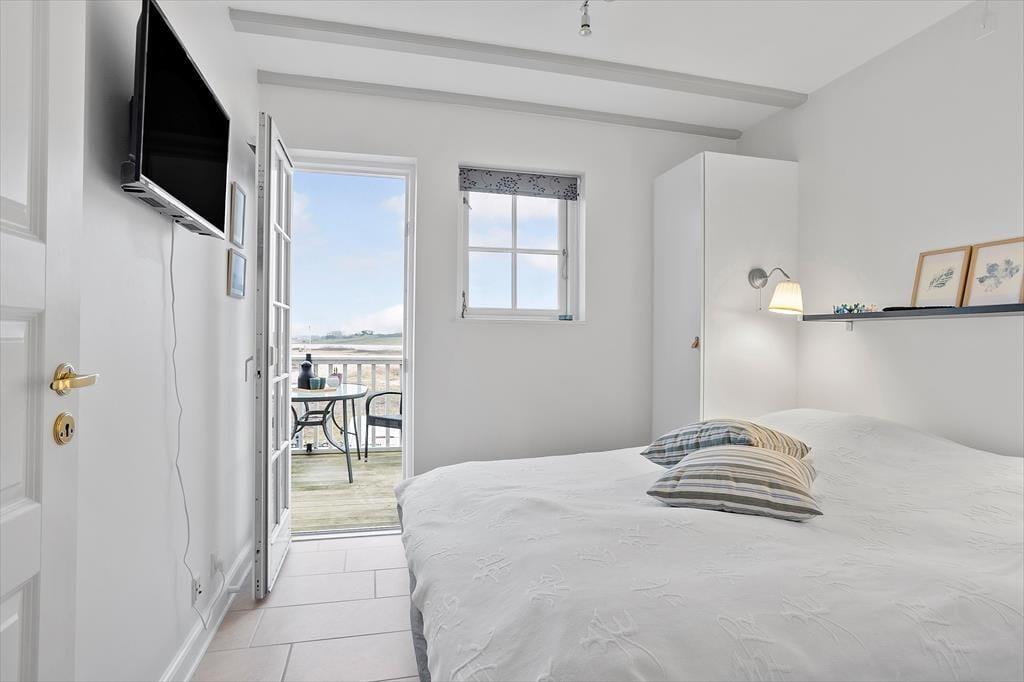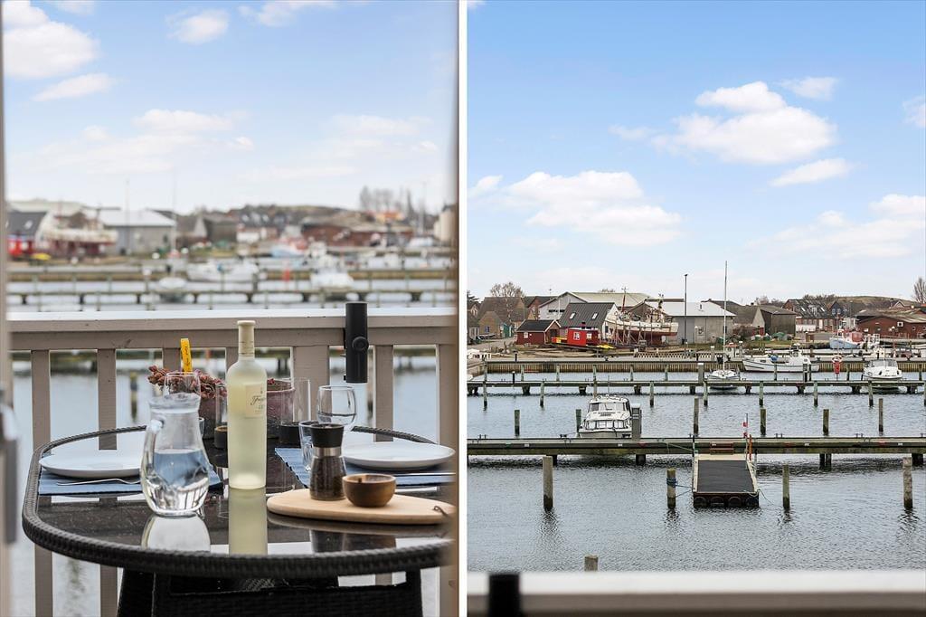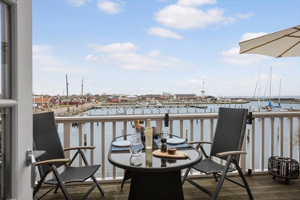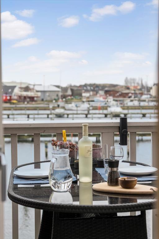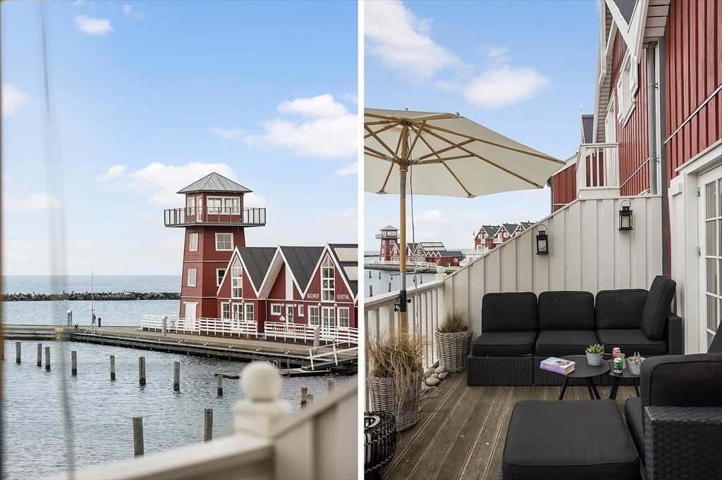 Udsigten er dejlig inde fra lejligheden, og den bliver kun mere imponerende, når du rykker driverlivet udenfor på en af de store terrasser. På den sydvestvendte terrasse kan du kigge lige ud på havnemiljøet, mens du slikker sol og drikker kaffe ved havebordet – hvis ikke du hellere vil rykke ind under parasollen for at tage et middagshvil i loungemøblerne. Det er fristende at blive her for at læse, løse krydsogtværser og grille, men udsigten over kystlandskabet er nu også så skøn fra den nordøstvendte terrasse, at du næsten skal prøve at slå dig ned her.