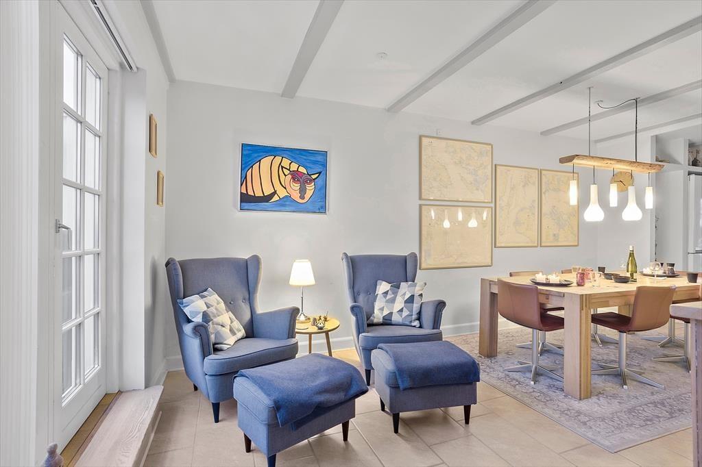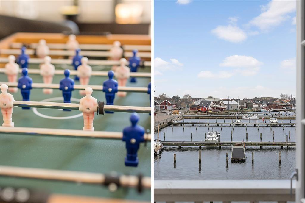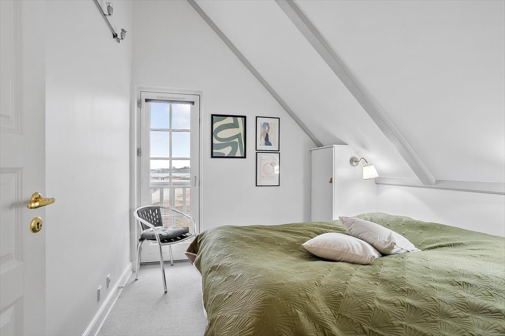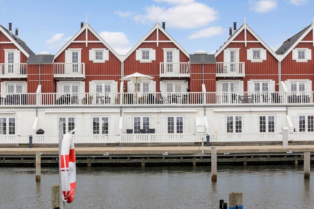 Lejligheden breder sig over første og anden sal i et af havneområdets karakteristiske ’Skagenhuse’. Det er den eneste feriebolig i byggeriet, der er udstyret med fire soveværelser, så der er som noget ganske særligt mulighed for at være op til otte personer inden døre. Hvis ferieboligen er fuld, er det for øvrigt rart, at der er to badeværelser at gøre godt med – og så er der endda spabad og sauna på det ene af dem. Opholdsrum er der også både oppe og nede, så uanset om du trænger til en rolig stund eller allerhelst vil hygge med resten af flokken, kan det fint lade sig gøre. I lejlighedens nederste plan kan I tænde op i indbygningspejsen, dække et smukt bord og samles til lækre måltider, mens overetagen indbyder til tilbagelænet afslapning, filmaftner og bordfodboldturneringer.