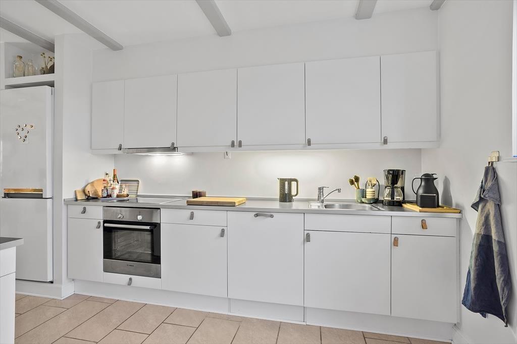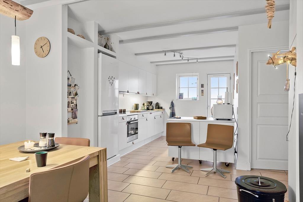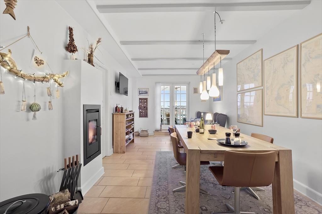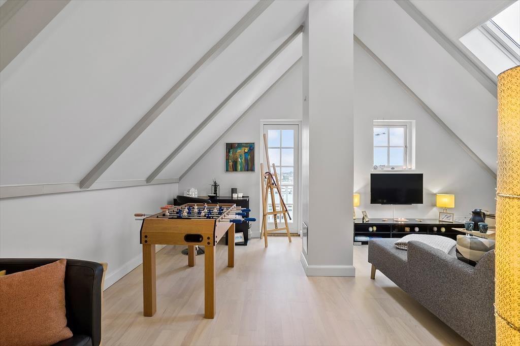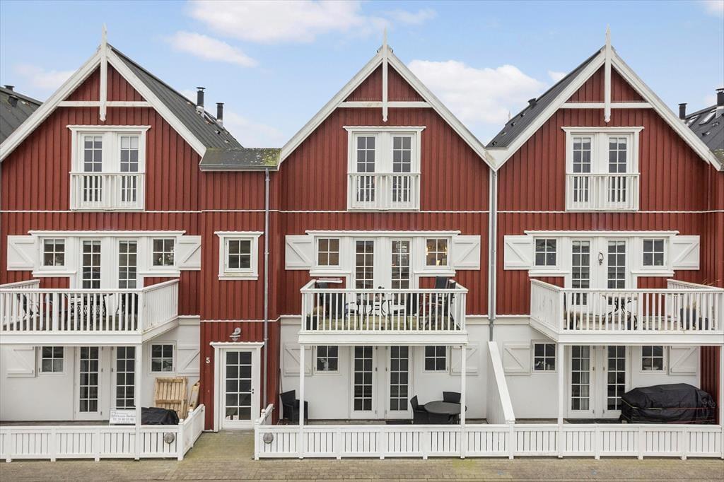 Lejligheden breder sig over første og anden sal i et af havneområdets karakteristiske ’Skagenhuse’. Det er den eneste feriebolig i byggeriet, der er udstyret med fire soveværelser, så der er som noget ganske særligt mulighed for at være op til otte personer inden døre. Hvis ferieboligen er fuld, er det for øvrigt rart, at der er to badeværelser at gøre godt med – og så er der endda spabad og sauna på det ene af dem. Opholdsrum er der også både oppe og nede, så uanset om du trænger til en rolig stund eller allerhelst vil hygge med resten af flokken, kan det fint lade sig gøre. I lejlighedens nederste plan kan I tænde op i indbygningspejsen, dække et smukt bord og samles til lækre måltider, mens overetagen indbyder til tilbagelænet afslapning, filmaftner og bordfodboldturneringer.
