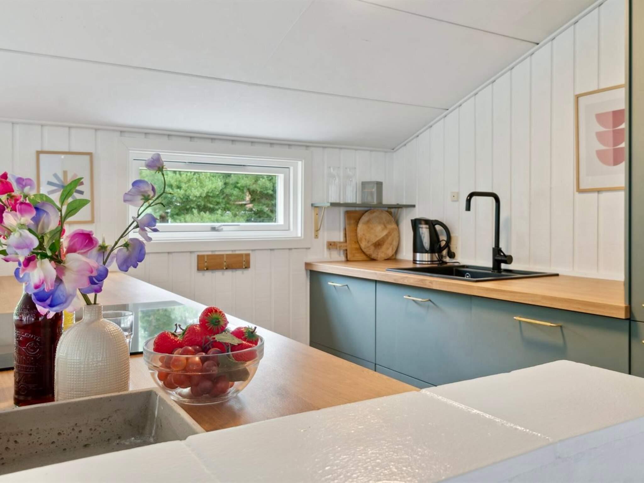 Køkkenet er veludstyret og velegnet til feriens måltider med blandt andet induktionskogeplade, varmluftovn, mikroovn og opvaskemaskine.