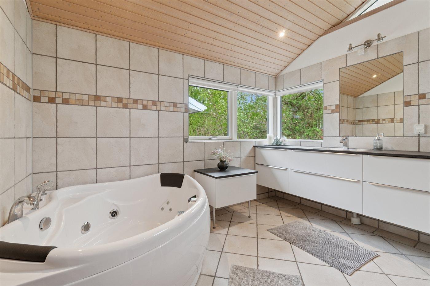 Der er 2 badeværelser med bruseniche og 2 toiletter. Der er gulvvarme på 2 badeværelser. I saunaen er der mulighed for afslapning.