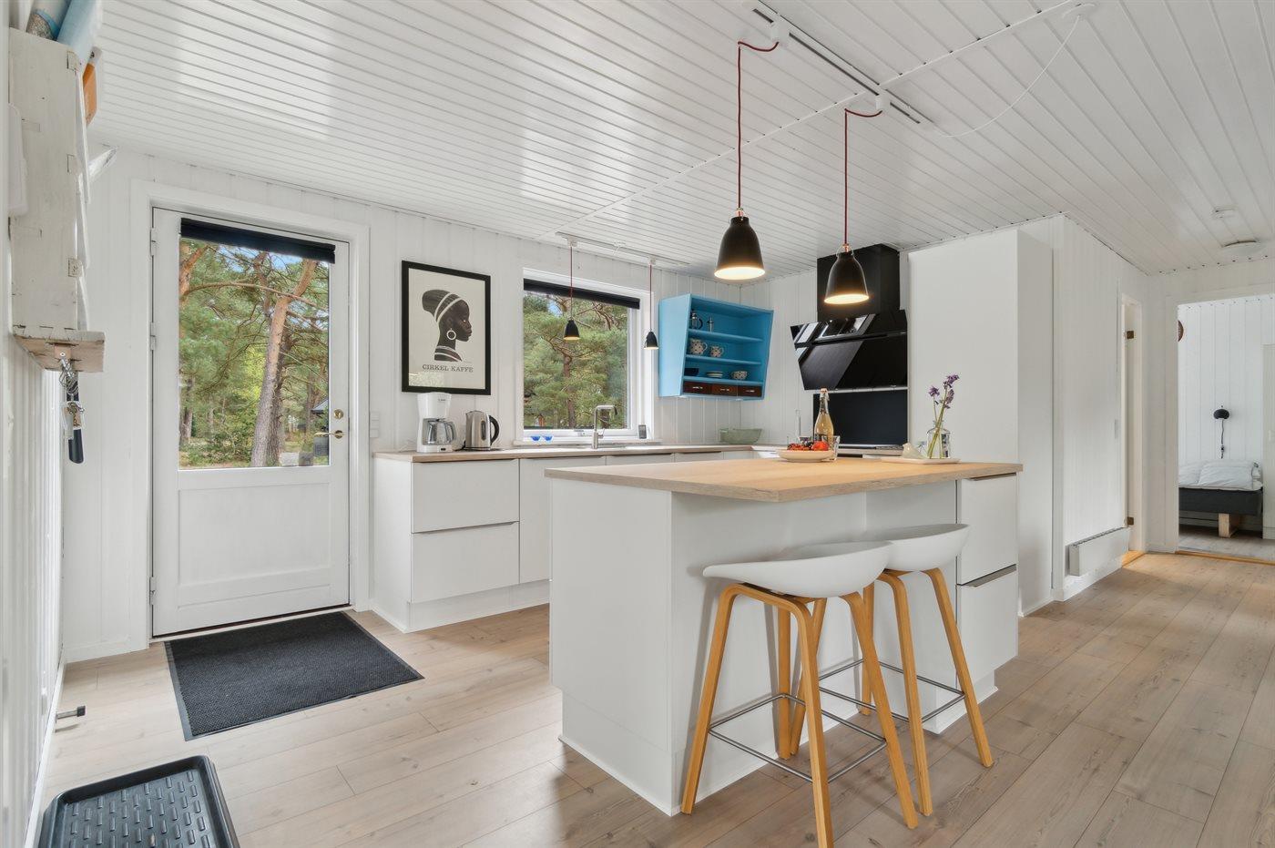 Køkkenet er udstyret med 1 køleskab. Der er 4 keramiske kogeplader, varmluftovn, mikrobølgeovn samt opvaskemaskine.