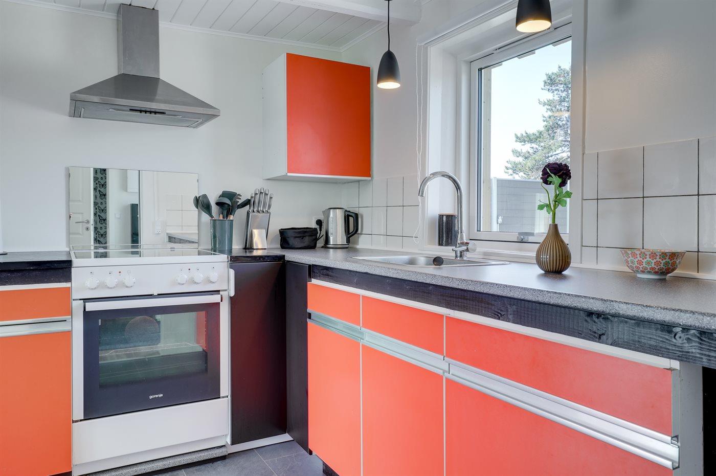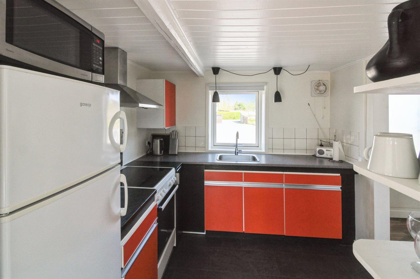 Køkkenet er udstyret med 1 køleskab. Der er 4 keramiske kogeplader, varmluftovn, mikrobølgeovn.
