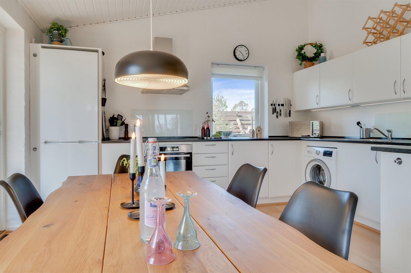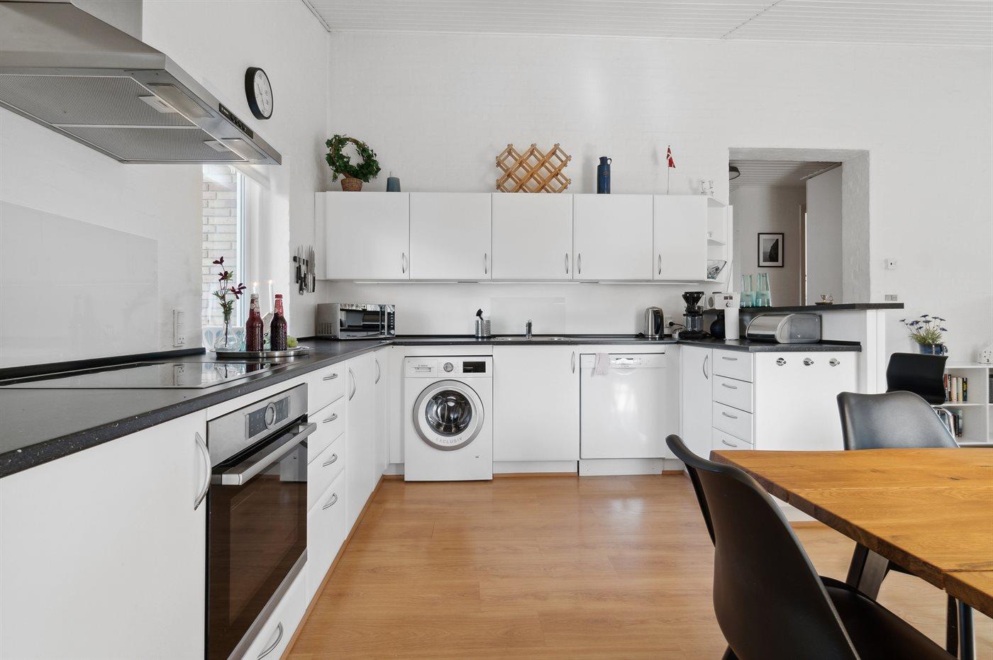 Køkkenet er udstyret med 1 køleskab. Der er 4 induktionskogeplader, varmluftovn, mikrobølgeovn samt opvaskemaskine.