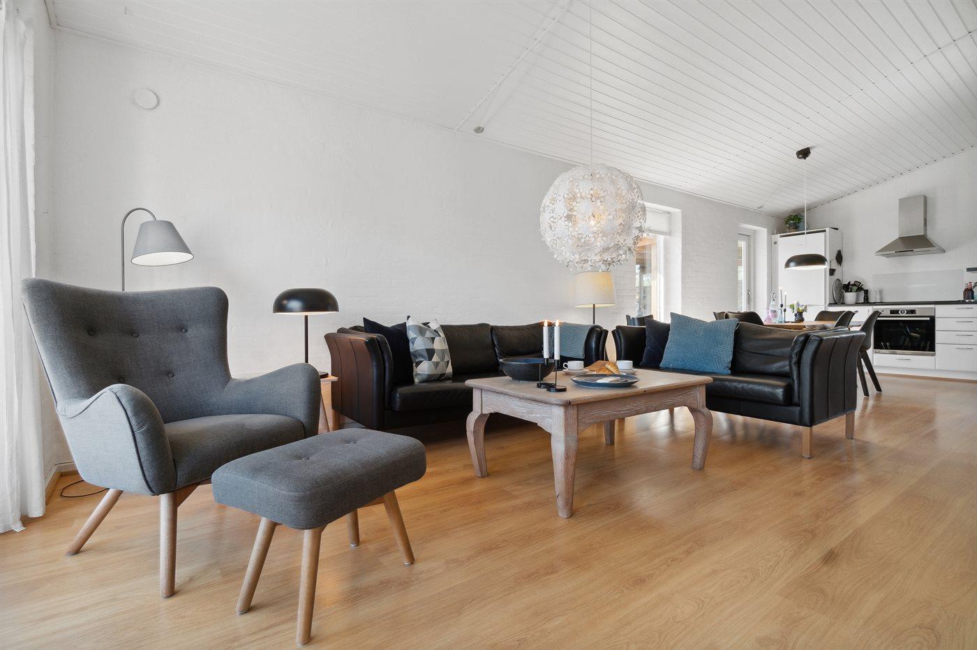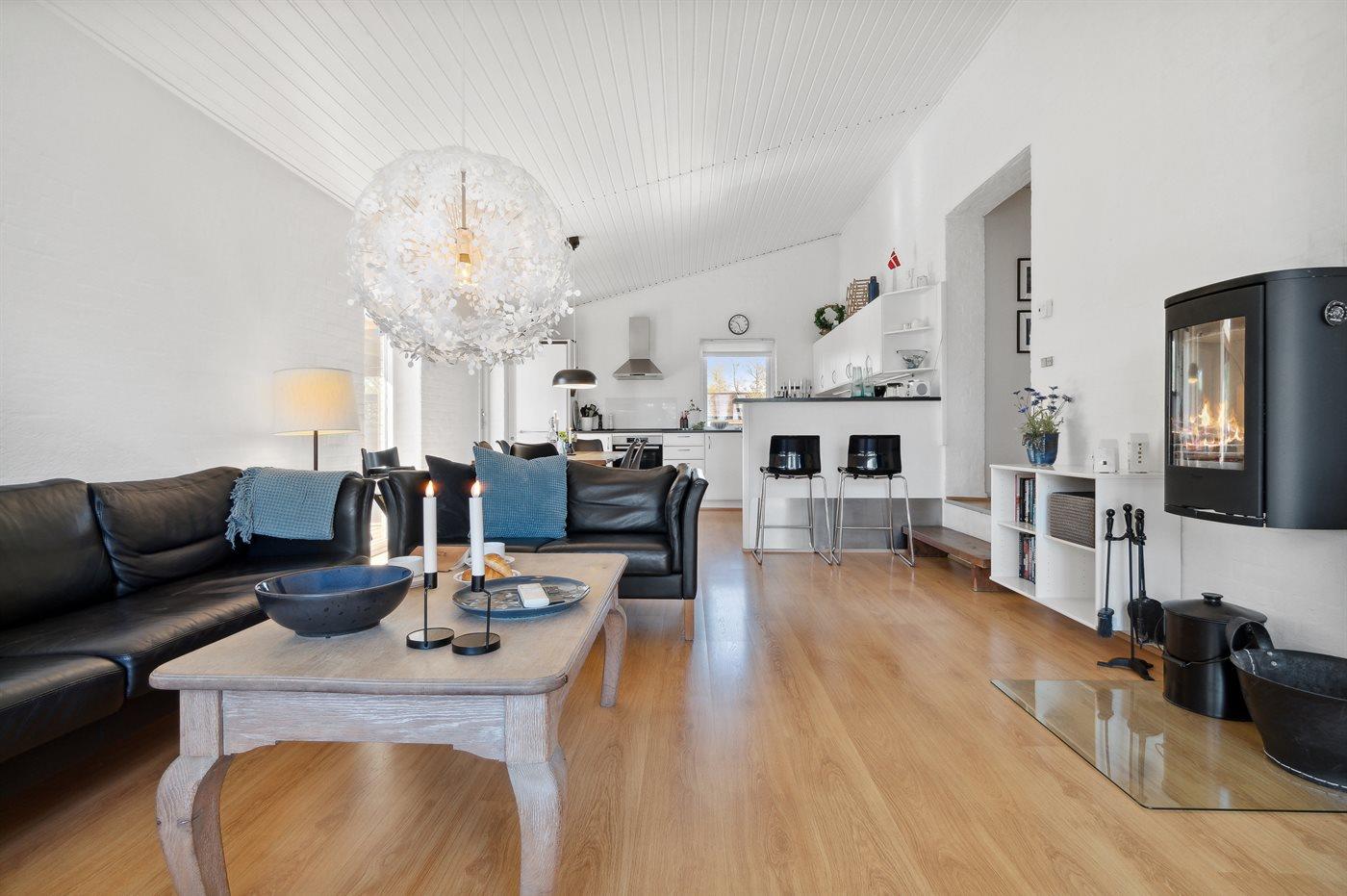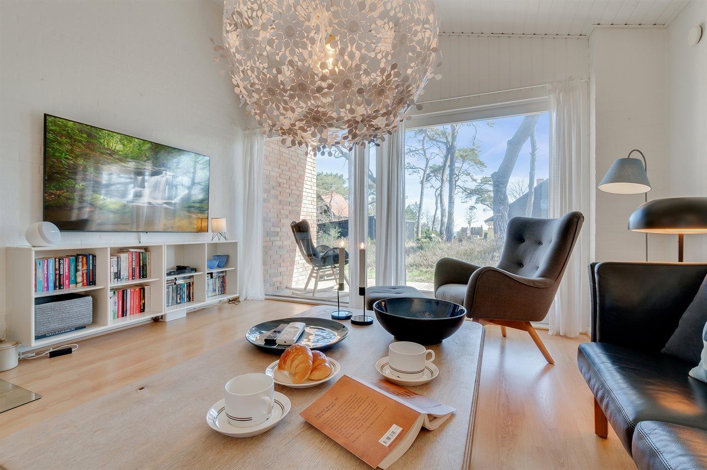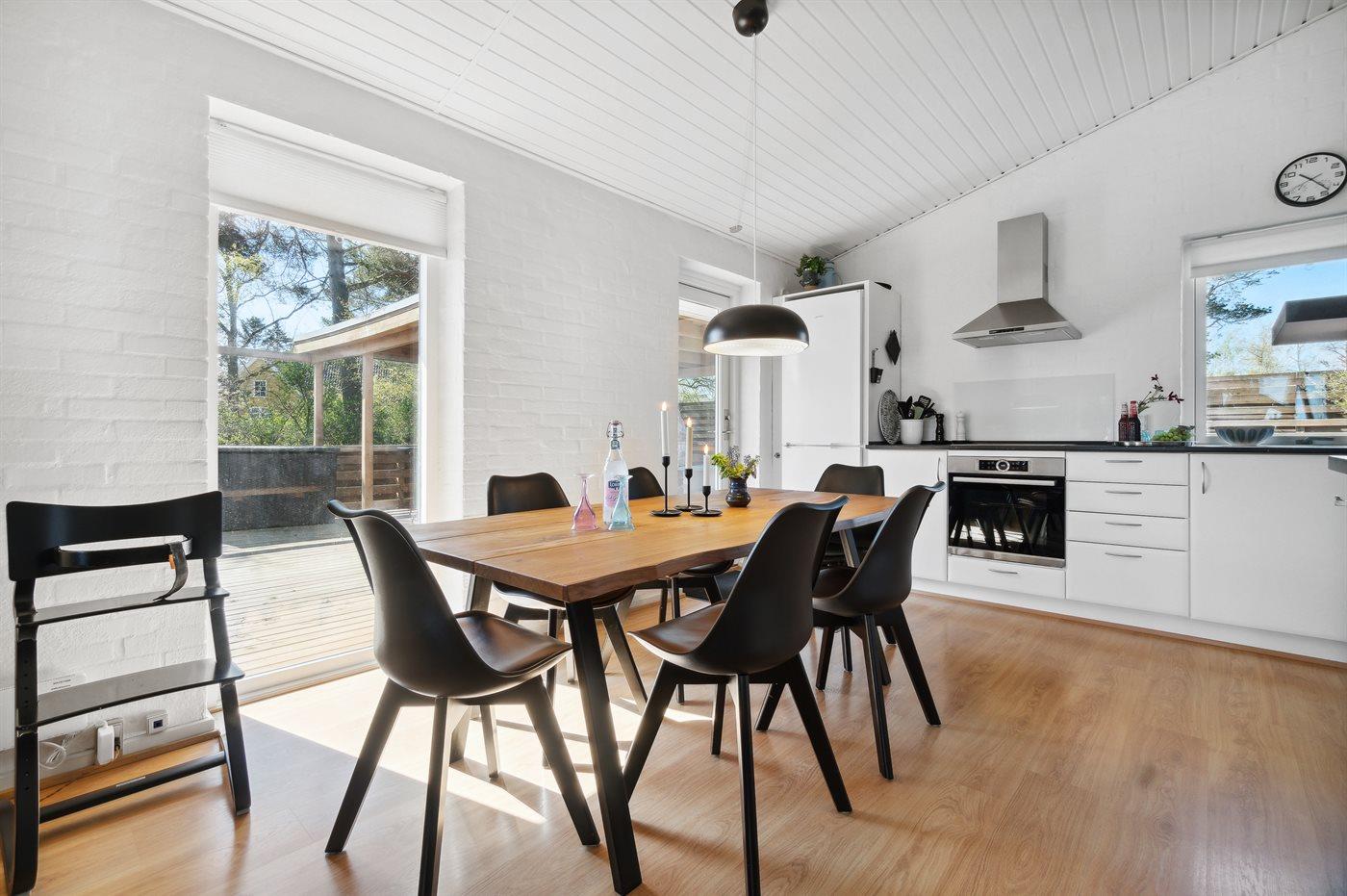 Husets specielle arkitektur gør, at huset er niveaudelt med en lille trappe ned til køkken/alrum og stue. Særdeles indbydende køkken i rigtig god kvalitet, og i stuen kan man følge vejrliget på nærmeste hold. Fra terrassen er der ligeledes havkig, så man altid er orienteret om, hvordan havet opfører sig. Huset er smagfuldt og samtidig praktisk indrettet, så både voksne og børn kan nyde ferien i fulde drag.