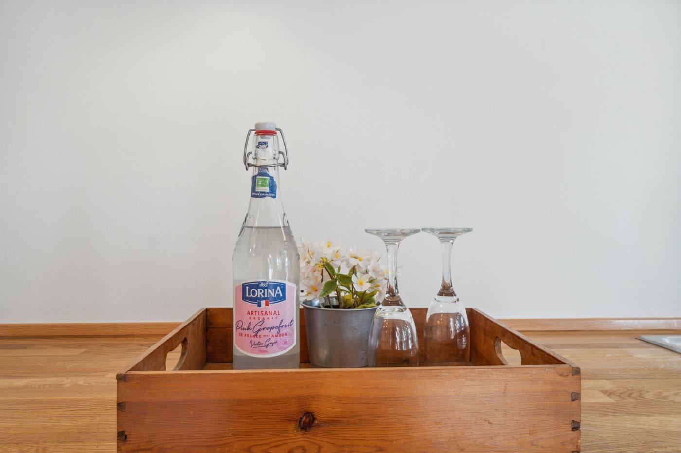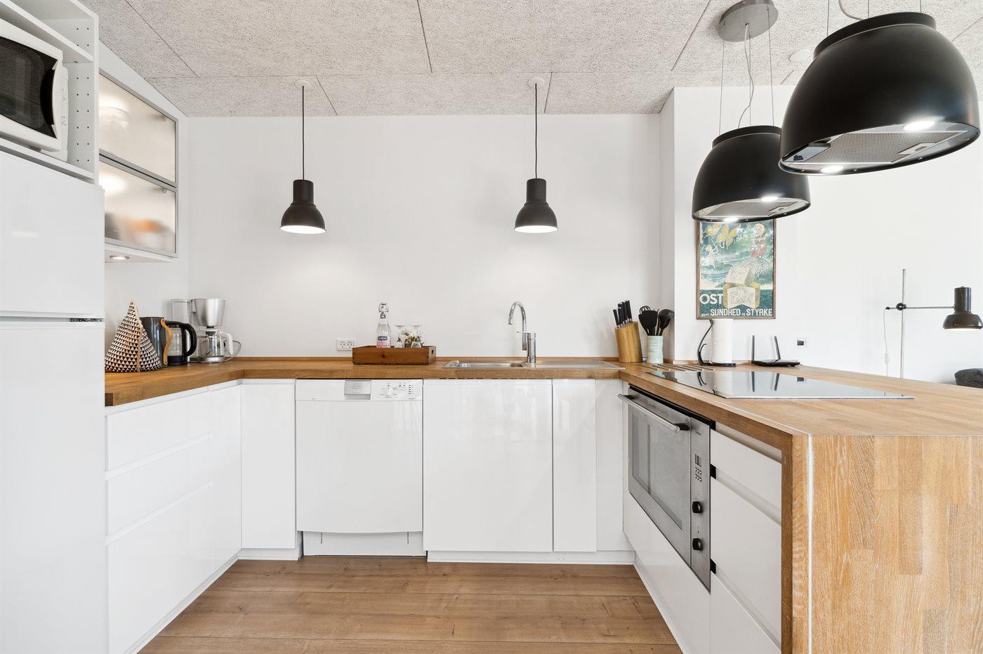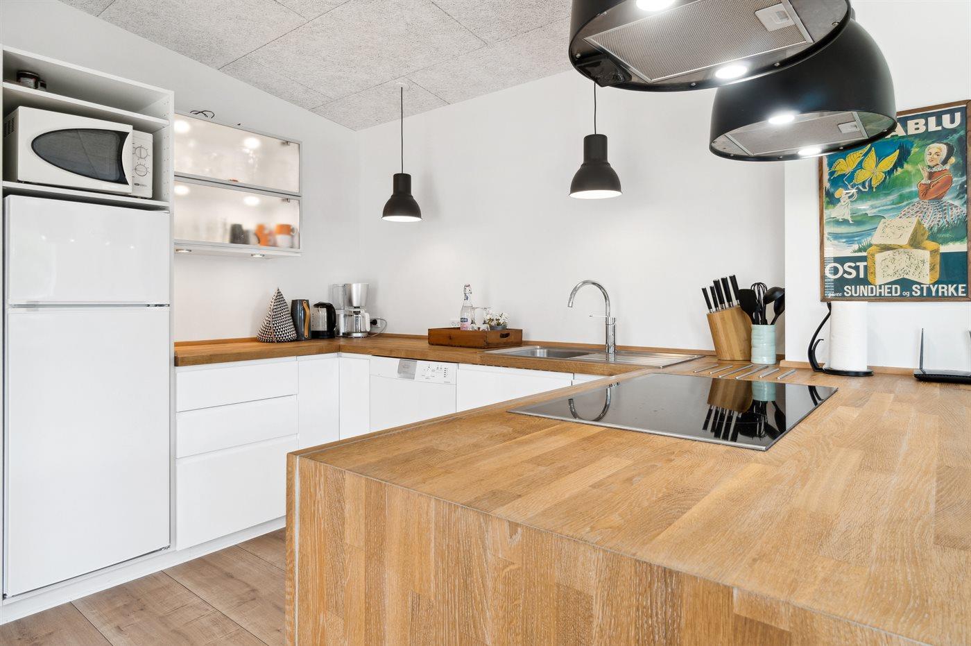 Køkkenet er udstyret med 1 køleskab. Der er 5 induktionskogeplader, varmluftovn, mikrobølgeovn samt opvaskemaskine.