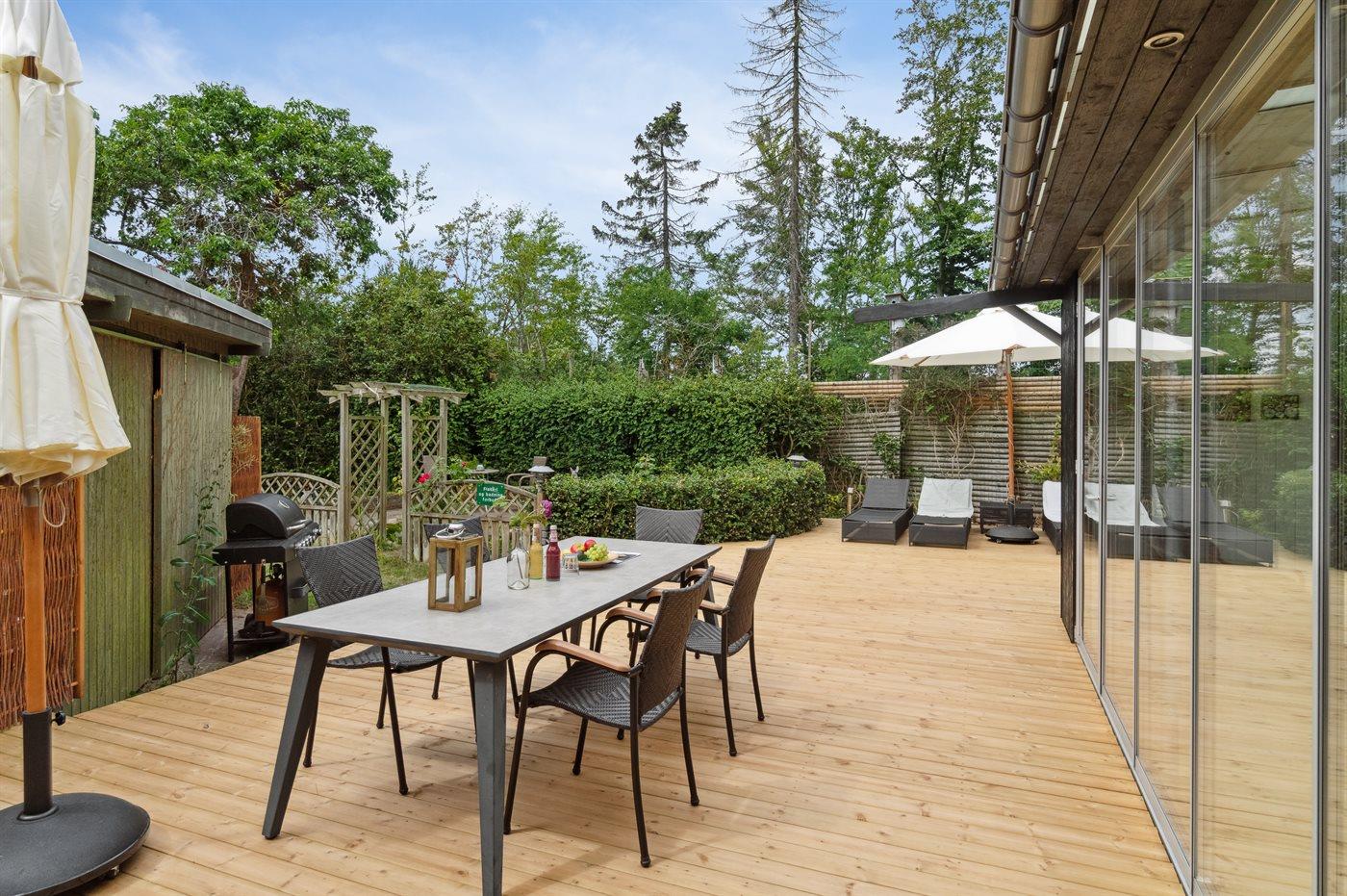 Ferieboligen er beliggende på en 150 m² stor naturgrund. Grunden er indhegnet. Der er 250 m til havet. Nærmeste forretning er beliggende i en afstand af 3000 m. Der er en golfbane i en afstand af 8000 m. Til ferieboligen hører 32 m² terrasseareal. Ligeledes er der adgang til udestue. Der er redskabsrum. Udendørs bruser. Grill til rådighed. Parkering ved ferieboligen.