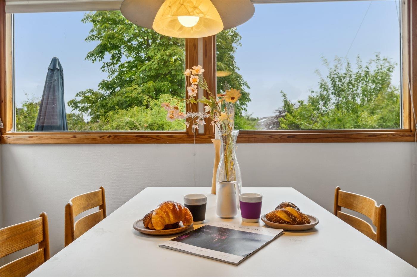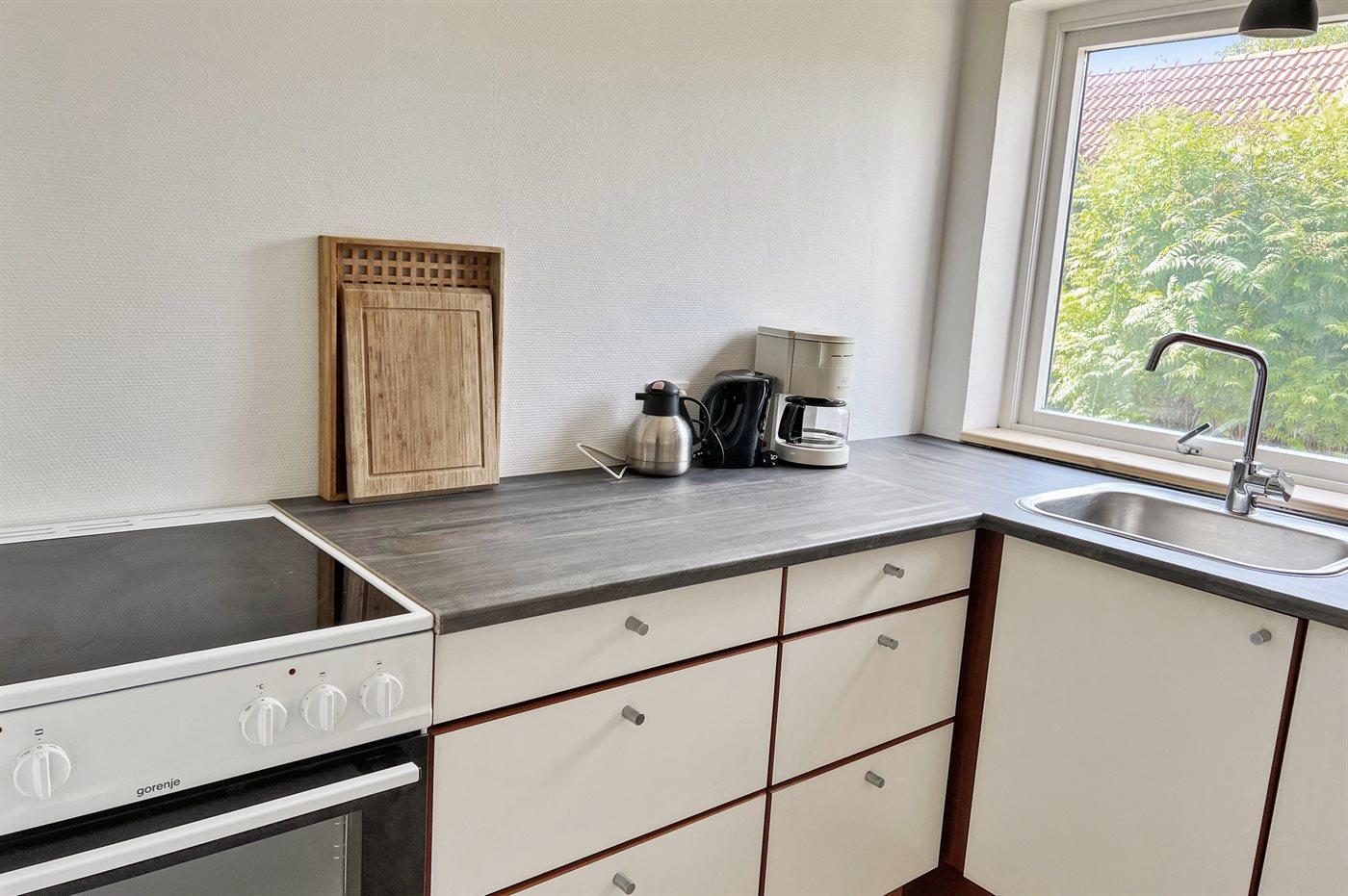 Køkkenet er udstyret med 1 køleskab. Der er 4 keramiske kogeplader, varmluftovn.