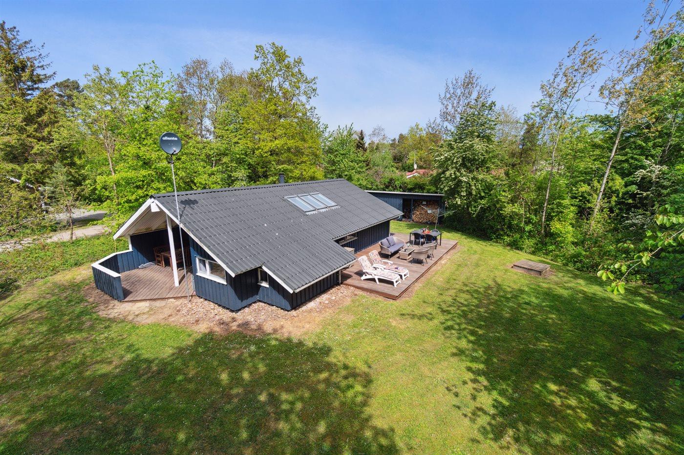 Ferieboligen er beliggende på en 1825 m² stor naturgrund. Der er 300 m til havet. Nærmeste forretning er beliggende i en afstand af 2500 m. Til ferieboligen hører 50 m² terrasseareal. Desuden er der 20 m² overdækket terrasse. Gynge. Sandkasse. Bålsted. Grill til rådighed. Der er installeret stik til opladning af elbil. Type 2 stik. Parkering ved ferieboligen.