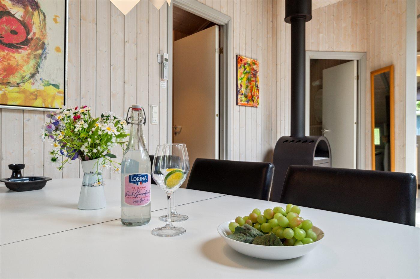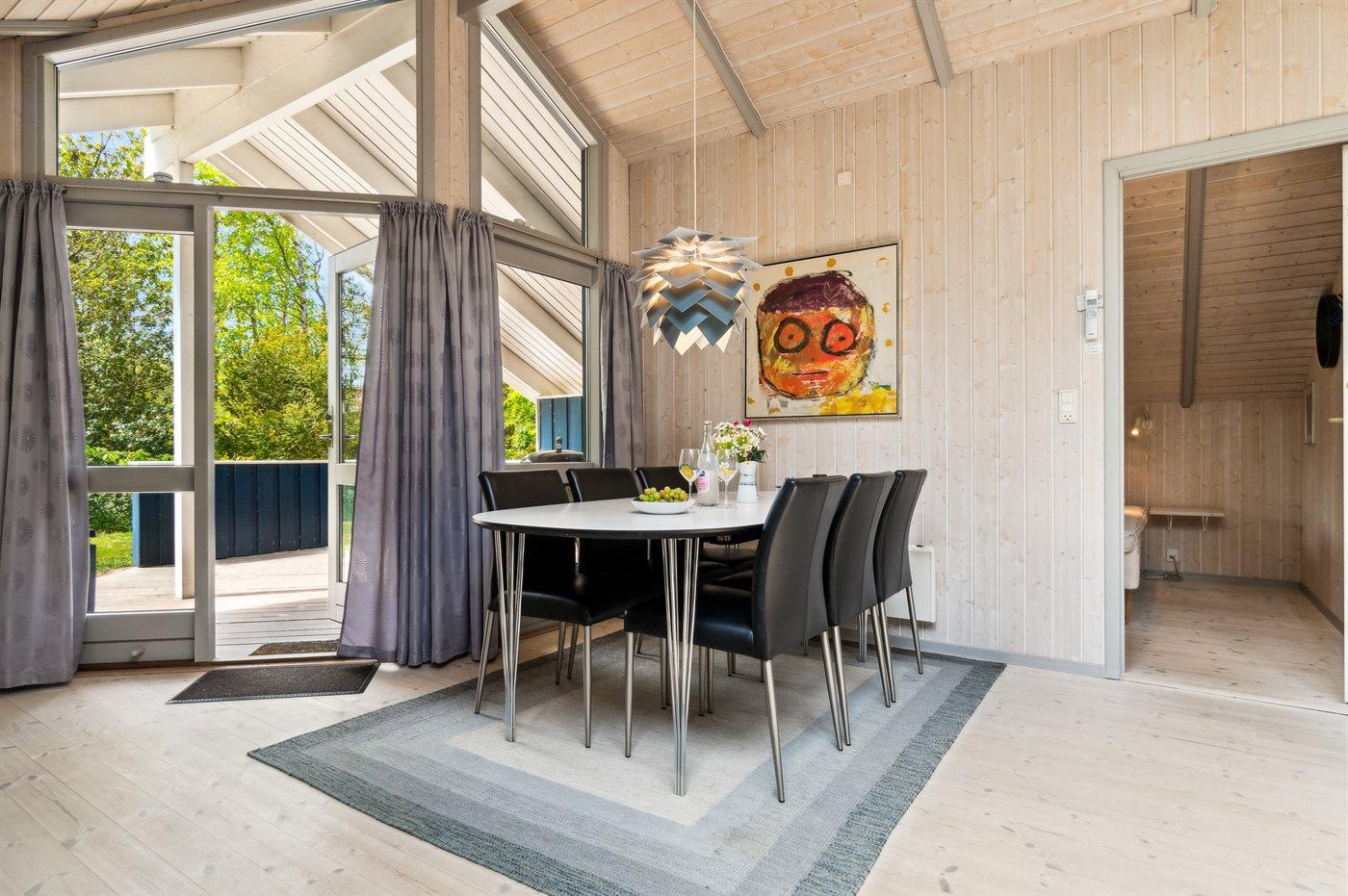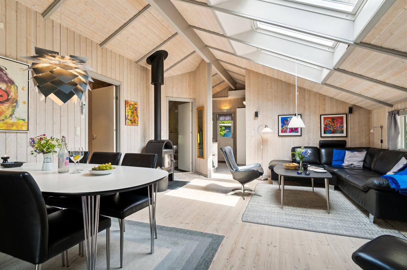 Huset fremtræder lyst og imødekommende, hvilket bl.a. skyldes de lyse fyrretræsgulve og de hvidmalede trævægge, men også husejerens sans for indretning og god møblering. I dette skønne sommerhus kan man nyde roen og de fredfyldte omgivelser – mens man holder ferie langt væk fra hverdagens stress og jag.