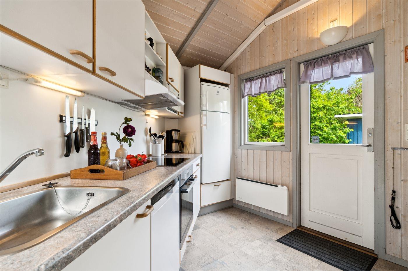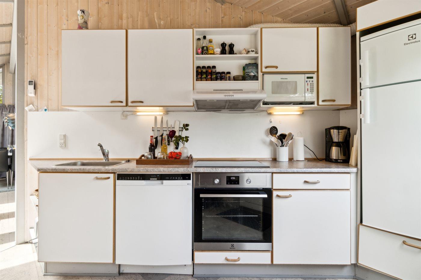 Køkkenet er udstyret med 1 køleskab. Der er 4 induktionskogeplader, varmluftovn, mikrobølgeovn samt opvaskemaskine.