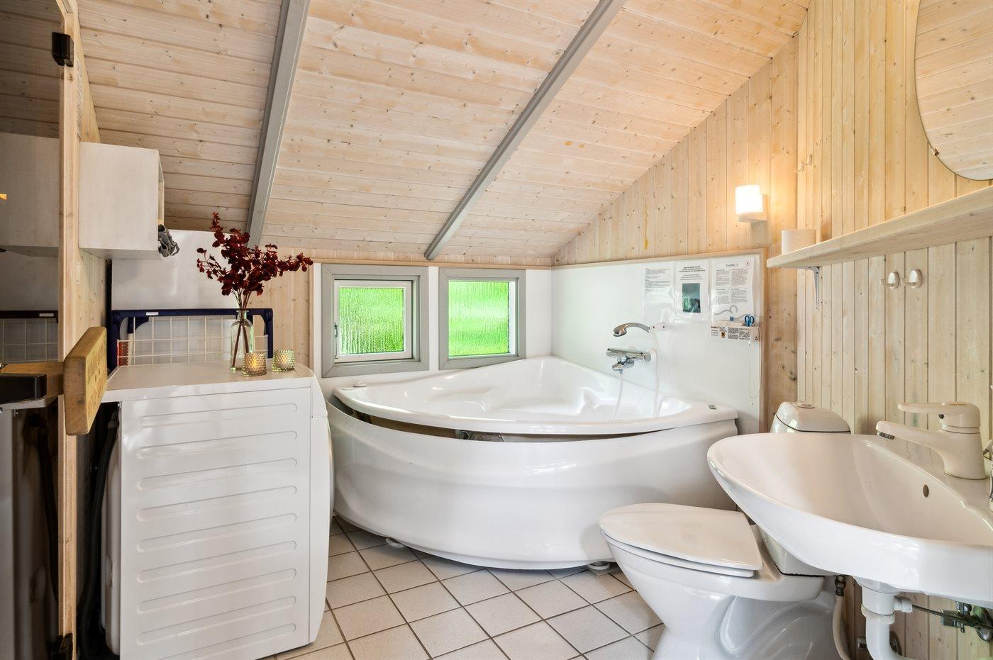 Der er 1 badeværelse med bruseniche og 1 toilet.. Der er gulvvarme på 1 badeværelse. I saunaen er der mulighed for afslapning.