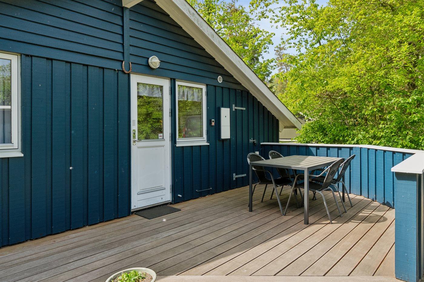 Når vejret er til det kan man nyde udelivet på den delvist overdækkede terrasse, hvor der er godt med læ – her er der lagt op til ægte familiehygge - eller man kan slappe af med en kop kaffe eller en god bog. På den østvendte morgenterrasse er der plads til at man kan nyde morgenkaffen, mens man lytter til naturens lyde.