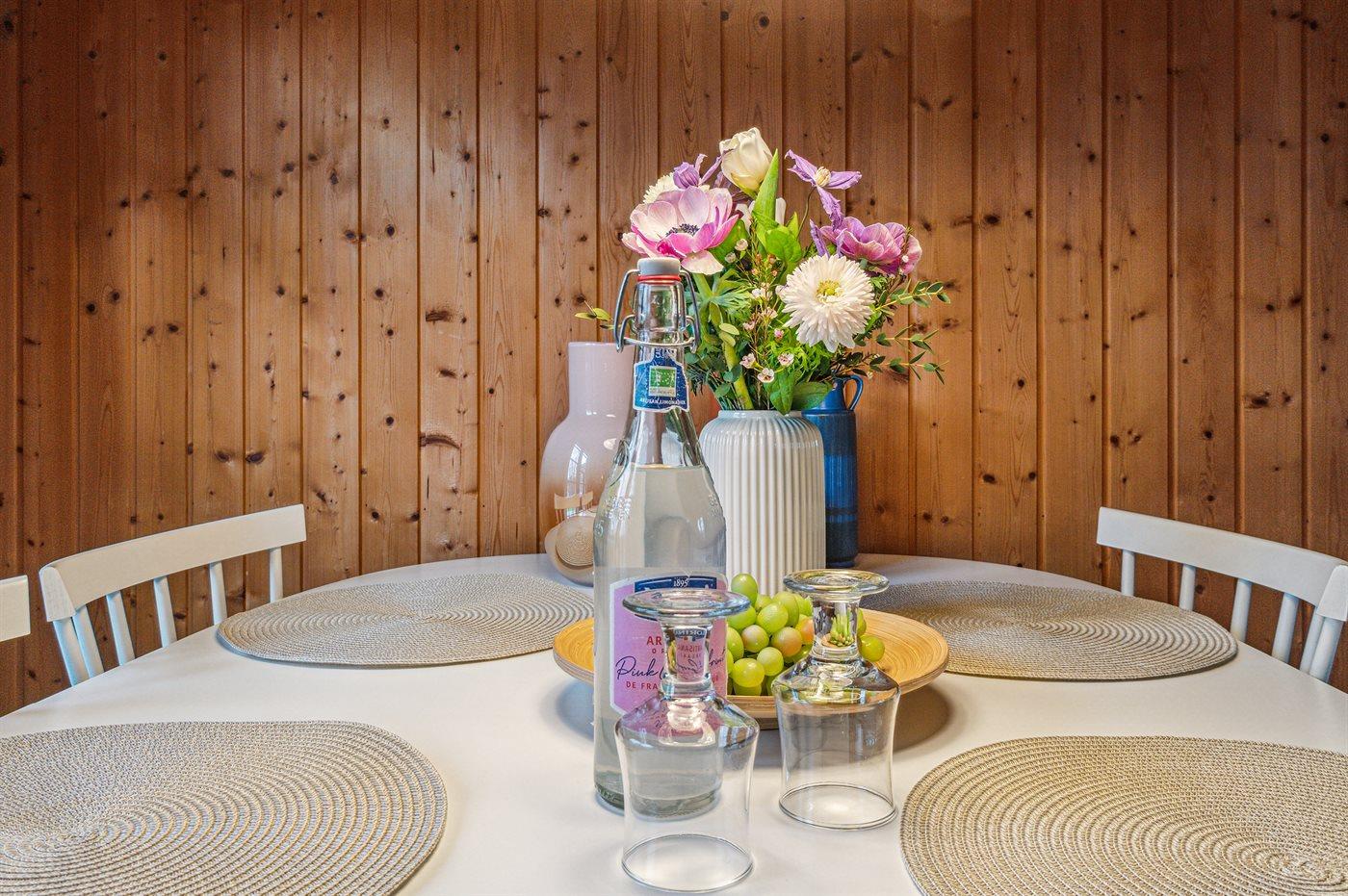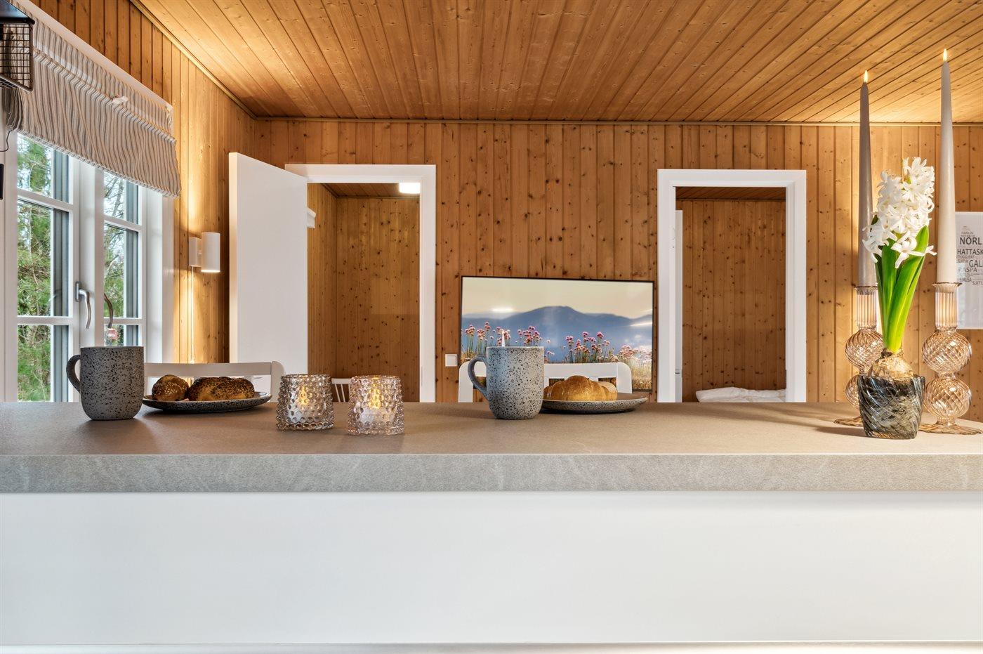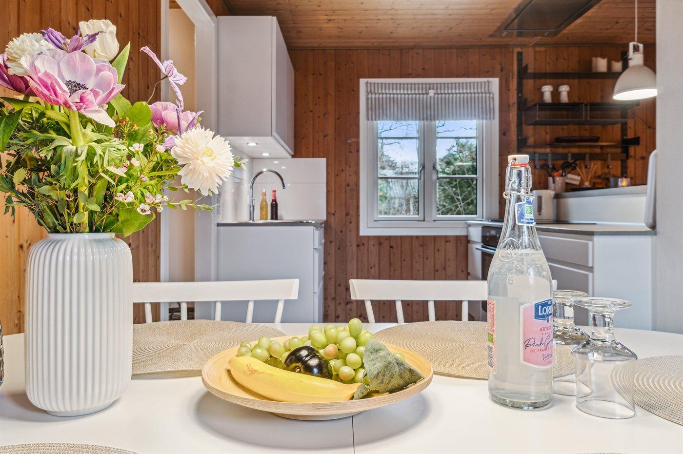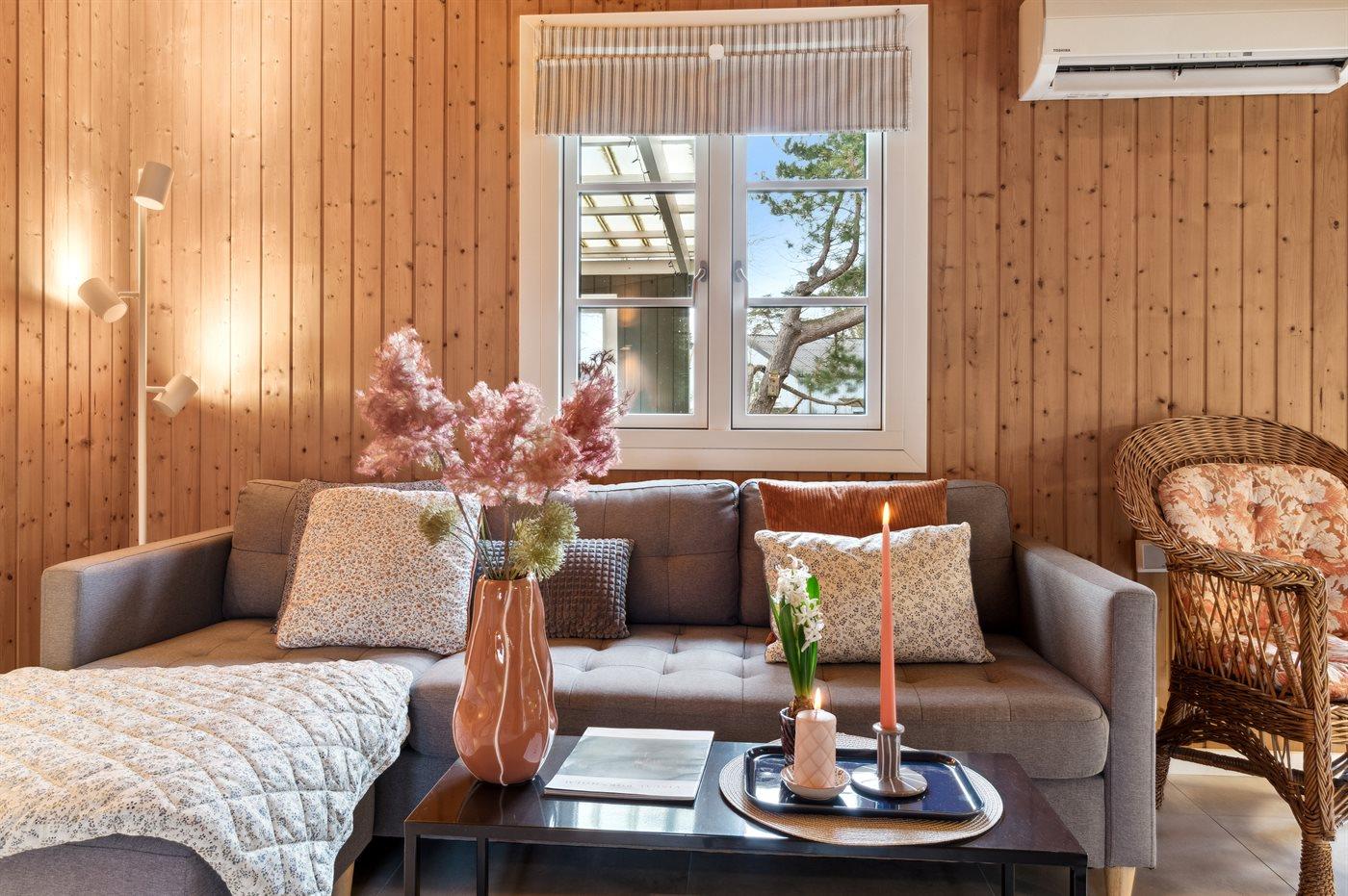 Velbeliggende feriehus i træ med hyggelig indretning.