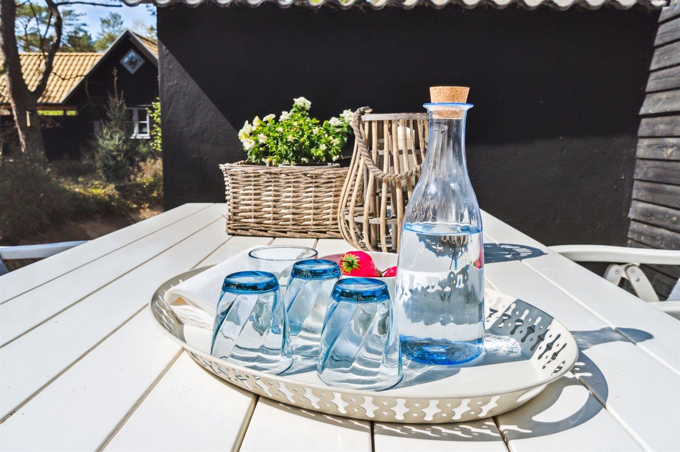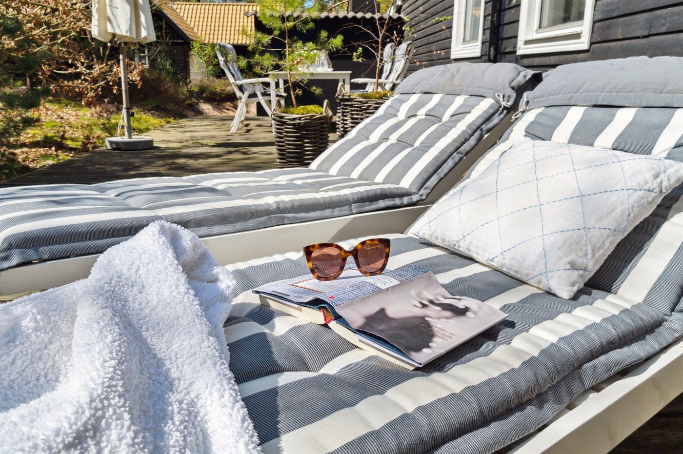 Ganske nær sandstranden på Balka ligger dette sommerhus på en fin naturgrund, som kan nydes fra de terrasser, der hører til huset. Der er tale om en større træterrasse og en hyggelig sandstensterrasse, hvorfra der er direkte adgang til udestuen. På grunden findes der lyng, små fyrretræer og som det er typisk for Balka birk og fyr i blandet bevoksning. Fra terrasserne kan man følge solens gang time for time. Her er der også mulighed for afslapning og grillhygge sammen med familien på aftenterrassen.