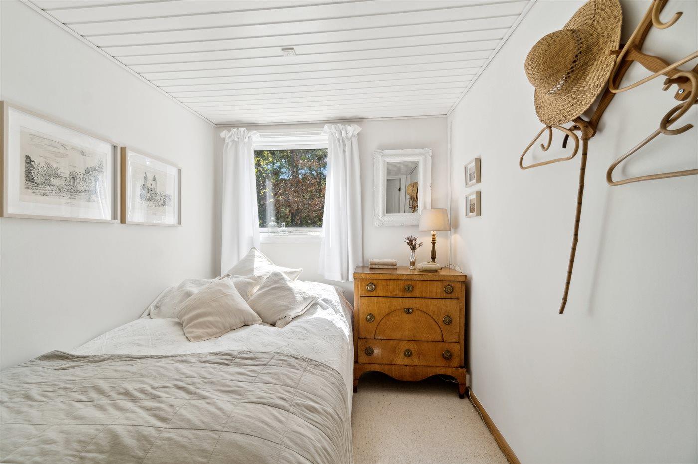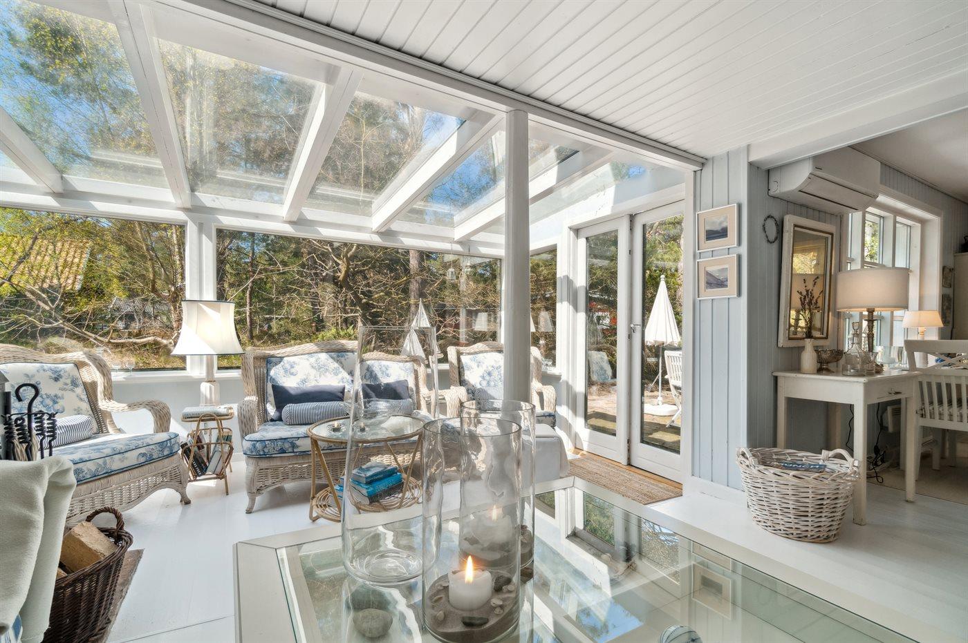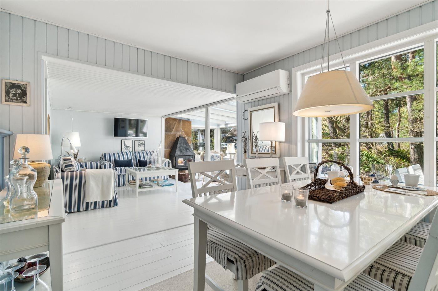 Der findes et flot nyt køkken, et pænt badeværelse og en stor opholdsstue med spiseafdeling, som ligger i åben forbindelse med en udestue, hvilket giver virkelig meget lys til det i forvejen lyse interiør. Alt interiør er farvemæssigt afstemt. Paneler, hvide vægge og lofter er alt sammen med til at understrege det lette og lyse indtryk af huset.