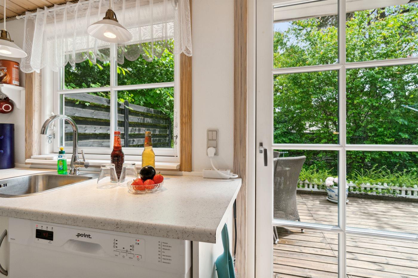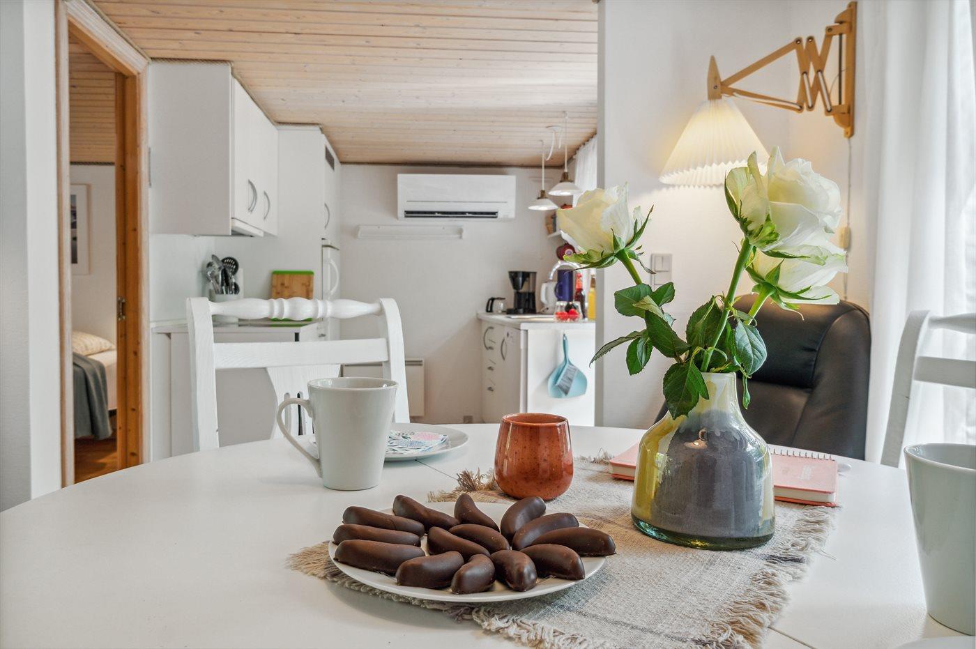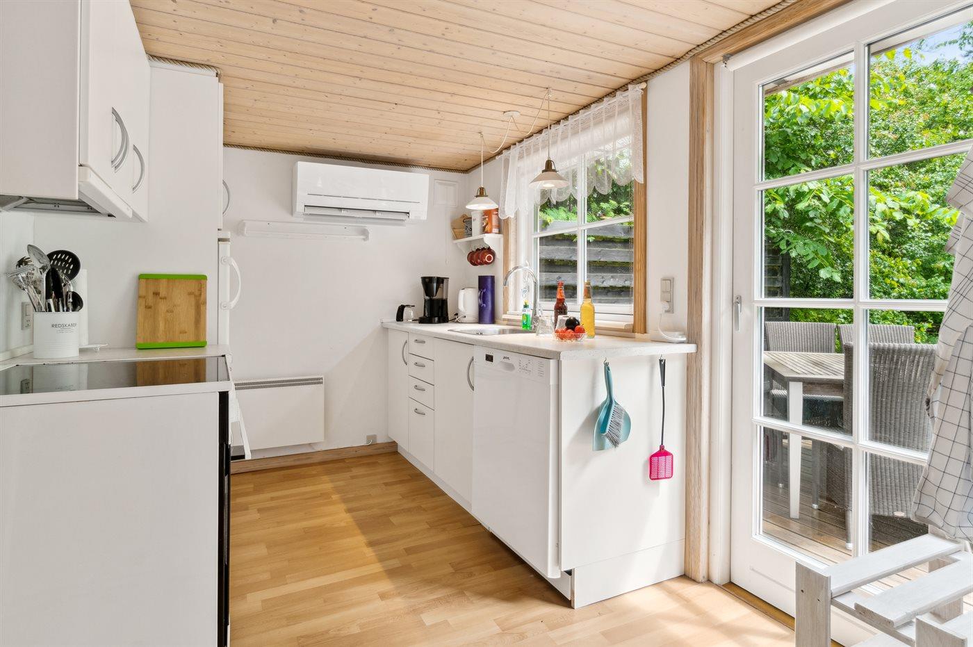 Køkkenet er udstyret med 1 køleskab. Der er 4 keramiske kogeplader, varmluftovn, mikrobølgeovn samt opvaskemaskine.