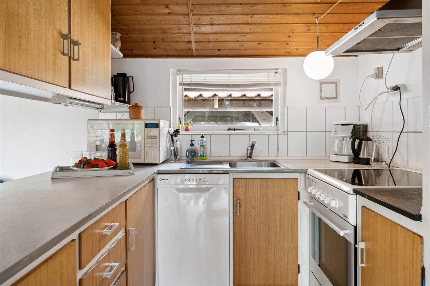 Køkkenet er udstyret med 1 køleskab. Der er 4 keramiske kogeplader, varmluftovn, mikrobølgeovn samt opvaskemaskine.
