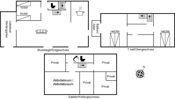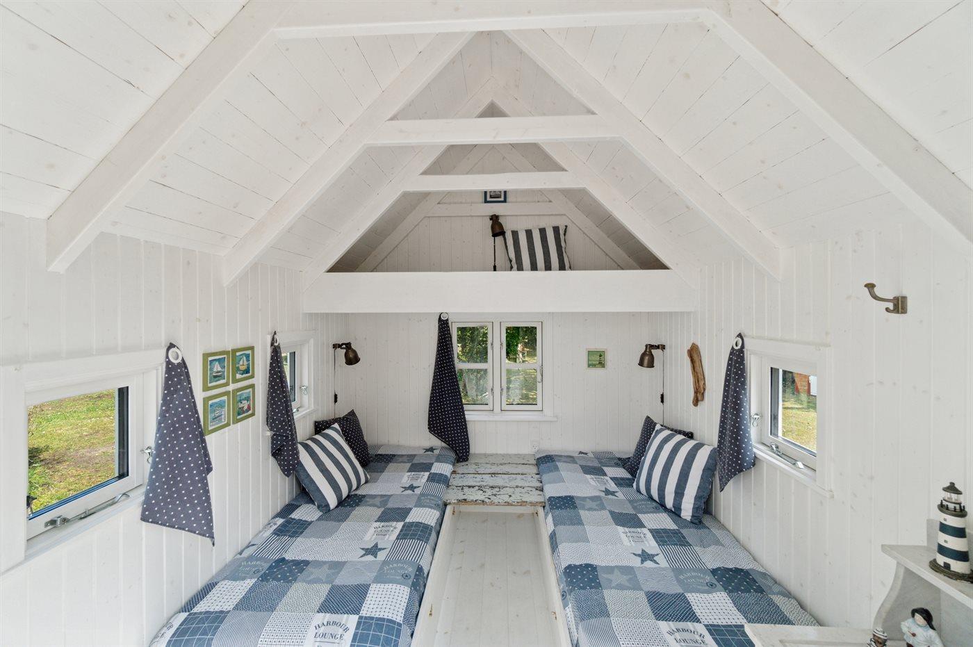 Der er i alt 3 soveværelser. Sovepladserne fordeler sig på: 4 sovepladser i dobbeltsenge. 2 sovepladser i enkeltsenge. Derudover er der 1 stk. barneseng.