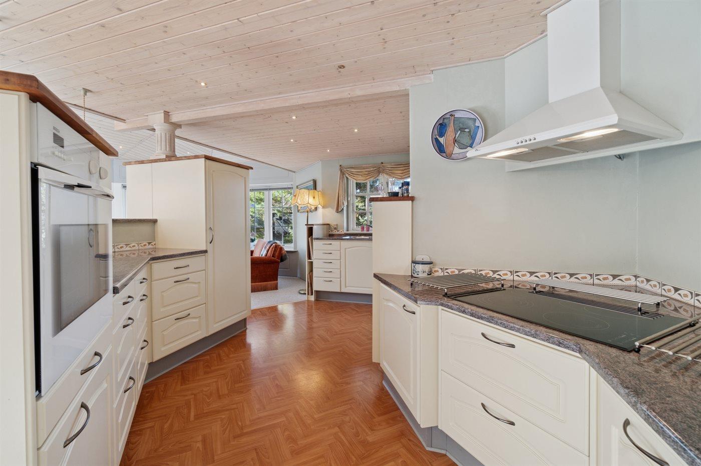 Køkkenet er udstyret med 1 køleskab. Der er 4 keramiske kogeplader, varmluftovn samt opvaskemaskine Der er gulvvarme i køkkenet.