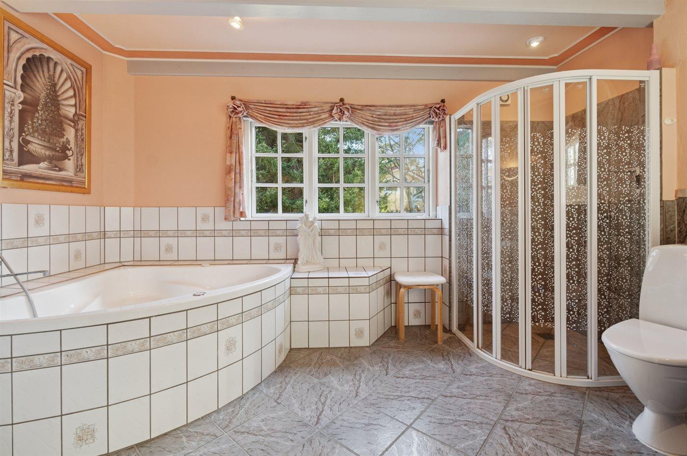 Der er 1 badeværelse med bruseniche og 2 toiletter, heraf 1 gæstetoilet. Der er gulvvarme på 1 badeværelse.