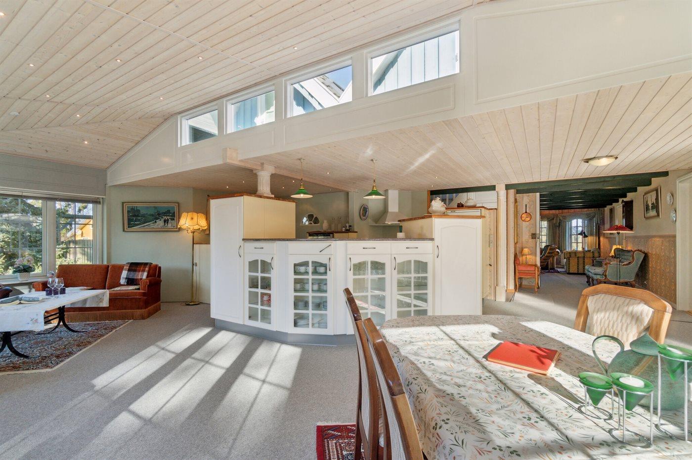 Huset er stort med flere stuer, flot køkkenafdeling og spa-badeværelse samt et større soveværelse med direkte udgang til lille morgenterrasse i stueplan. På 1. sal finder man foruden gæstetoilettet også to soveværelser, en hygge repos og altan, der er delvis overdækket og afskærmet.