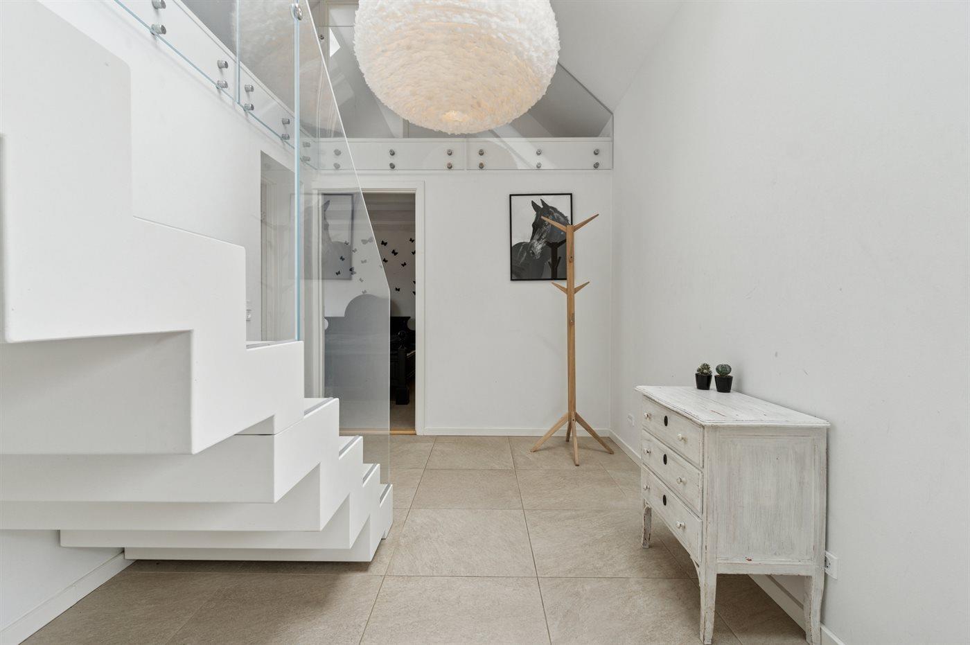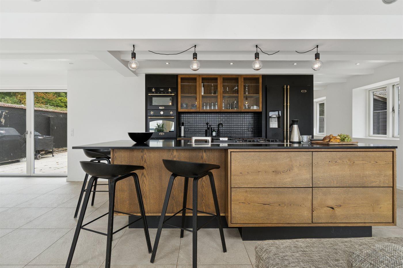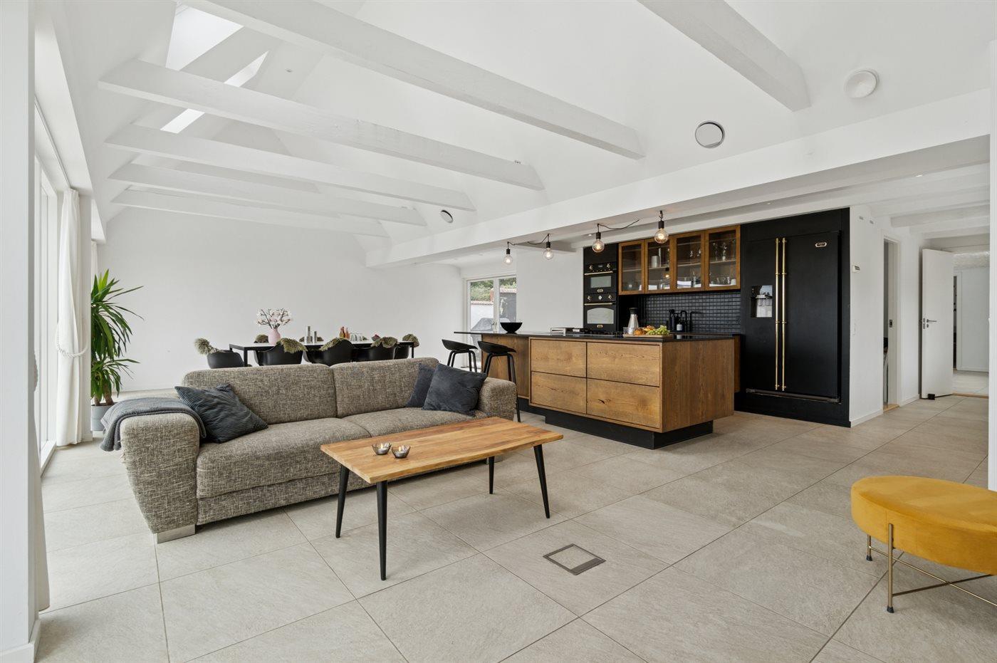 I den store køkken alrum-afdeling, der er en del af den lyse opholdsstue, mødes man af et fantastisk lysindfald. Køkkenafdelingen er i rigtig høj kvalitet og fremtræder i farvevalg og udførsel særdeles indbydende, hvor Quooker og indbygget el-grill er en del af køkkenudstyret. Der er et større badeværelse med et godt bademiljø.