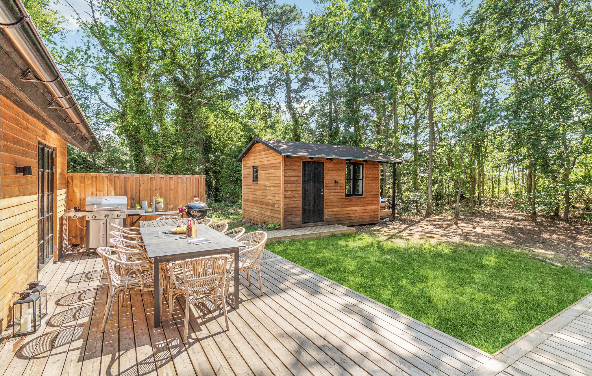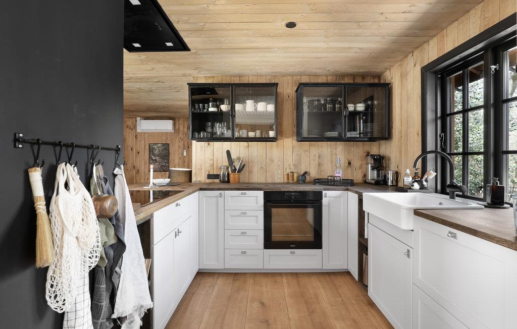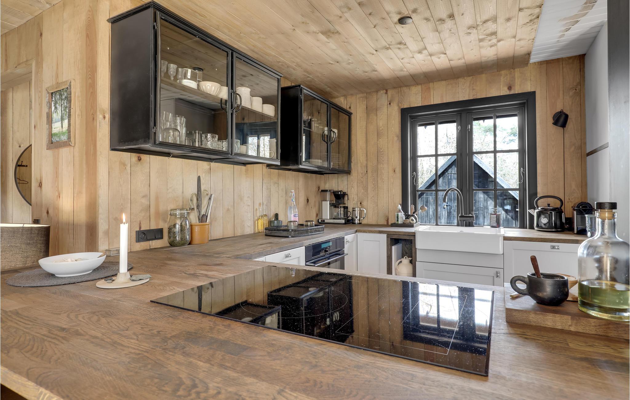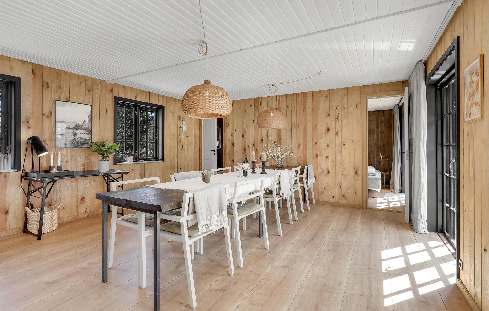 Velkommen til dette underskønne feriehus med en næsten hytteagtig stemning indvendigt, takket være de stemningsfulde trævægge, -gulve og -lofter. Huset er gennemgående smagfuldt indrettet og byder blandt andet på en stor, flot spiseplads, et rummeligt og meget veludstyret køkken og et yderst komfortabelt sofaarrangement med fladskærm, hvor I kan holde hyggelige filmaftener. Huset har plads til mange gæster og kan således rumme flere familier, der ønsker at tilbringe en vidunderlig ferie sammen på Solskinsøen.