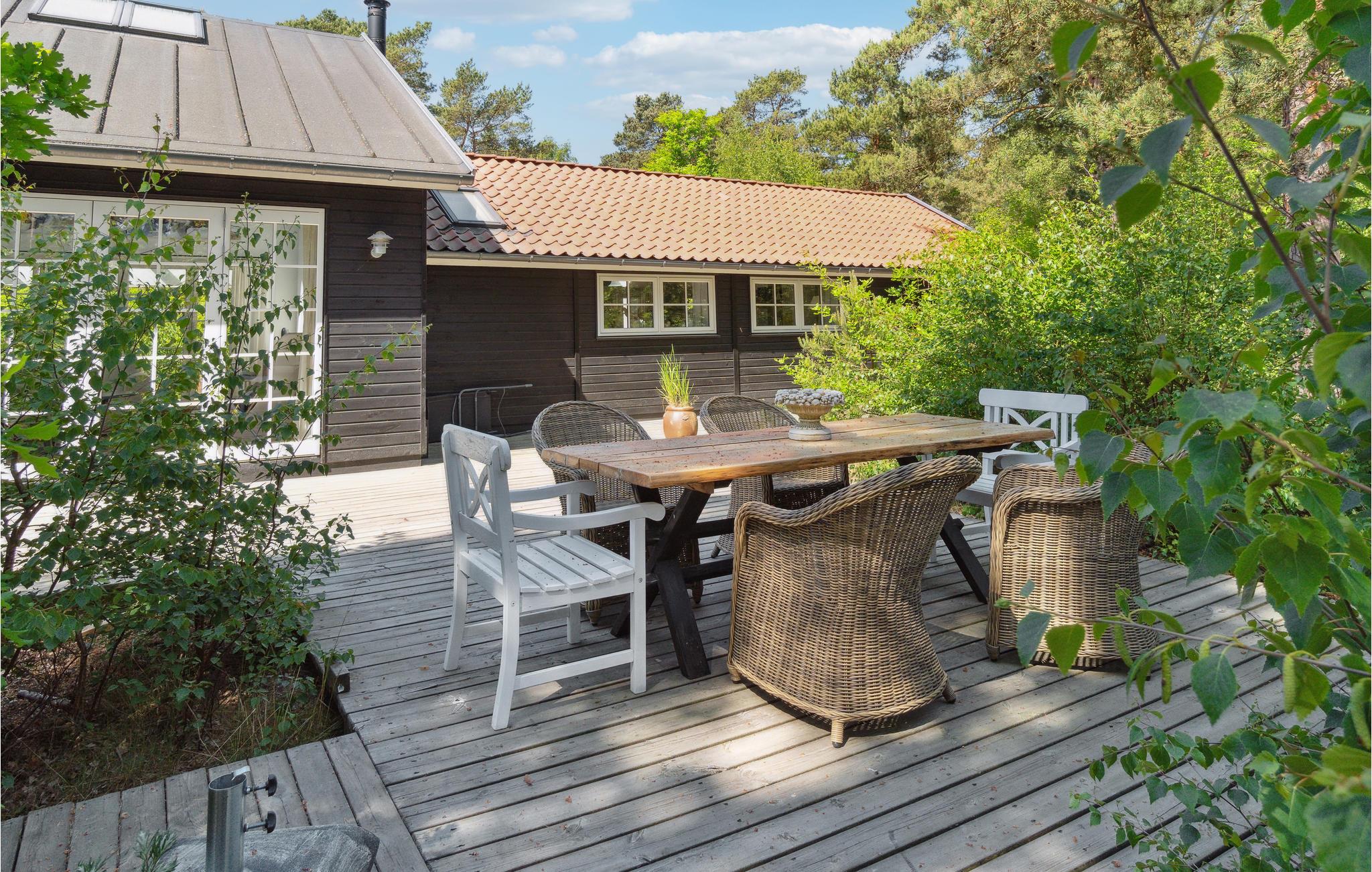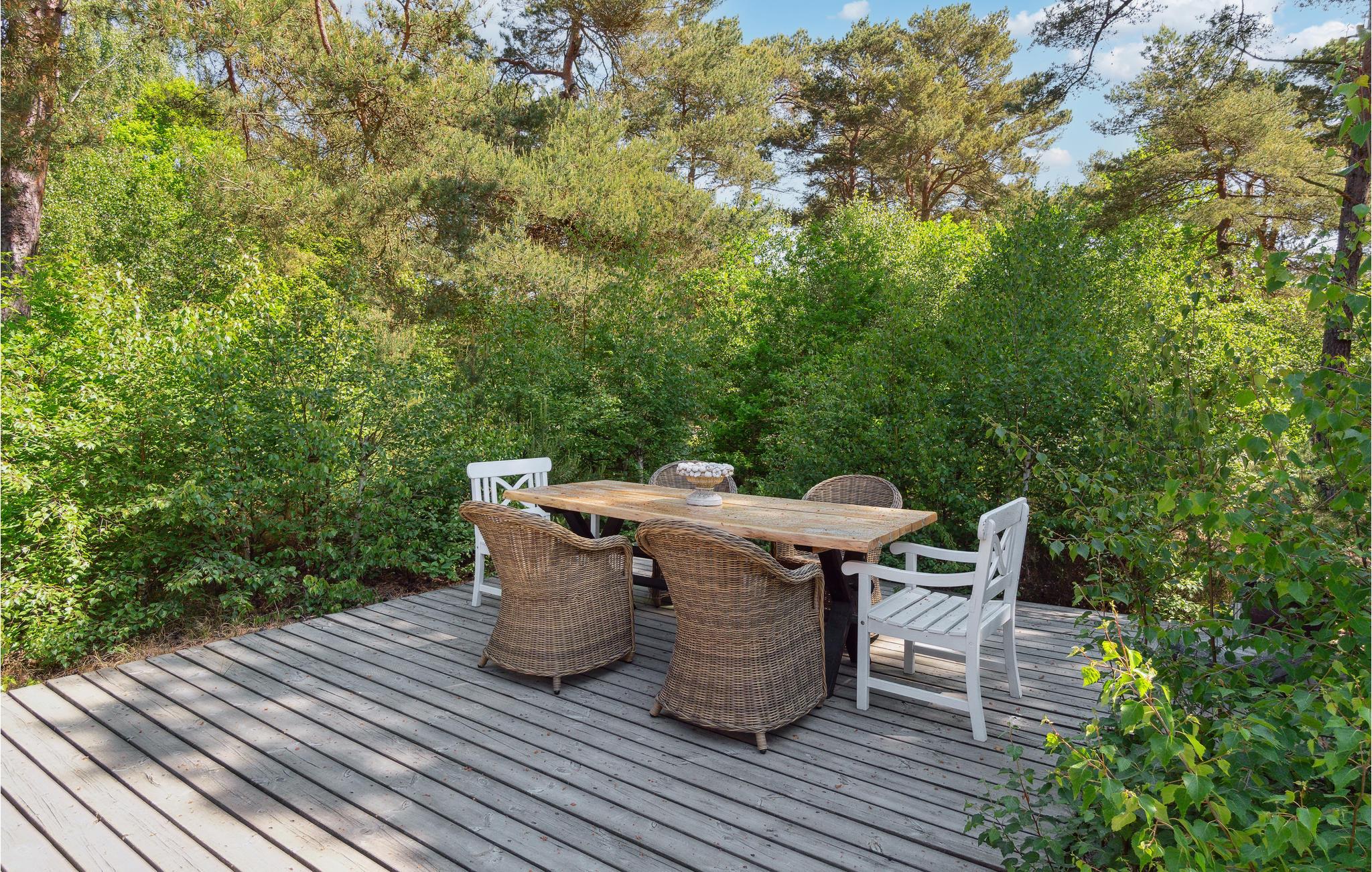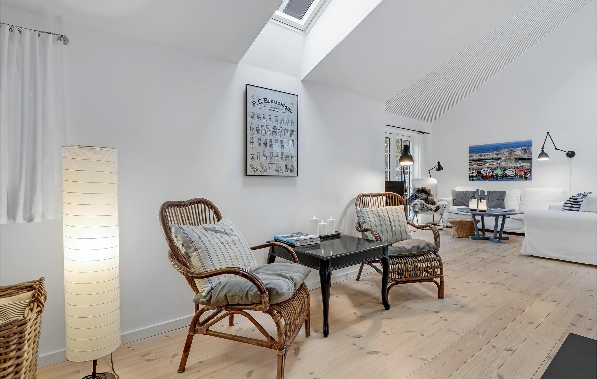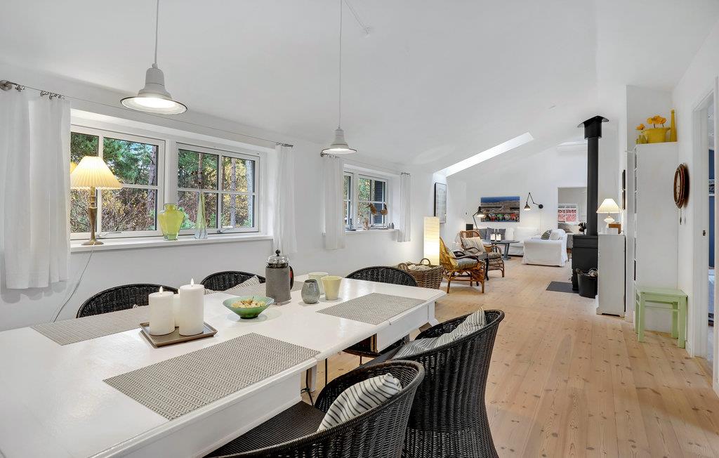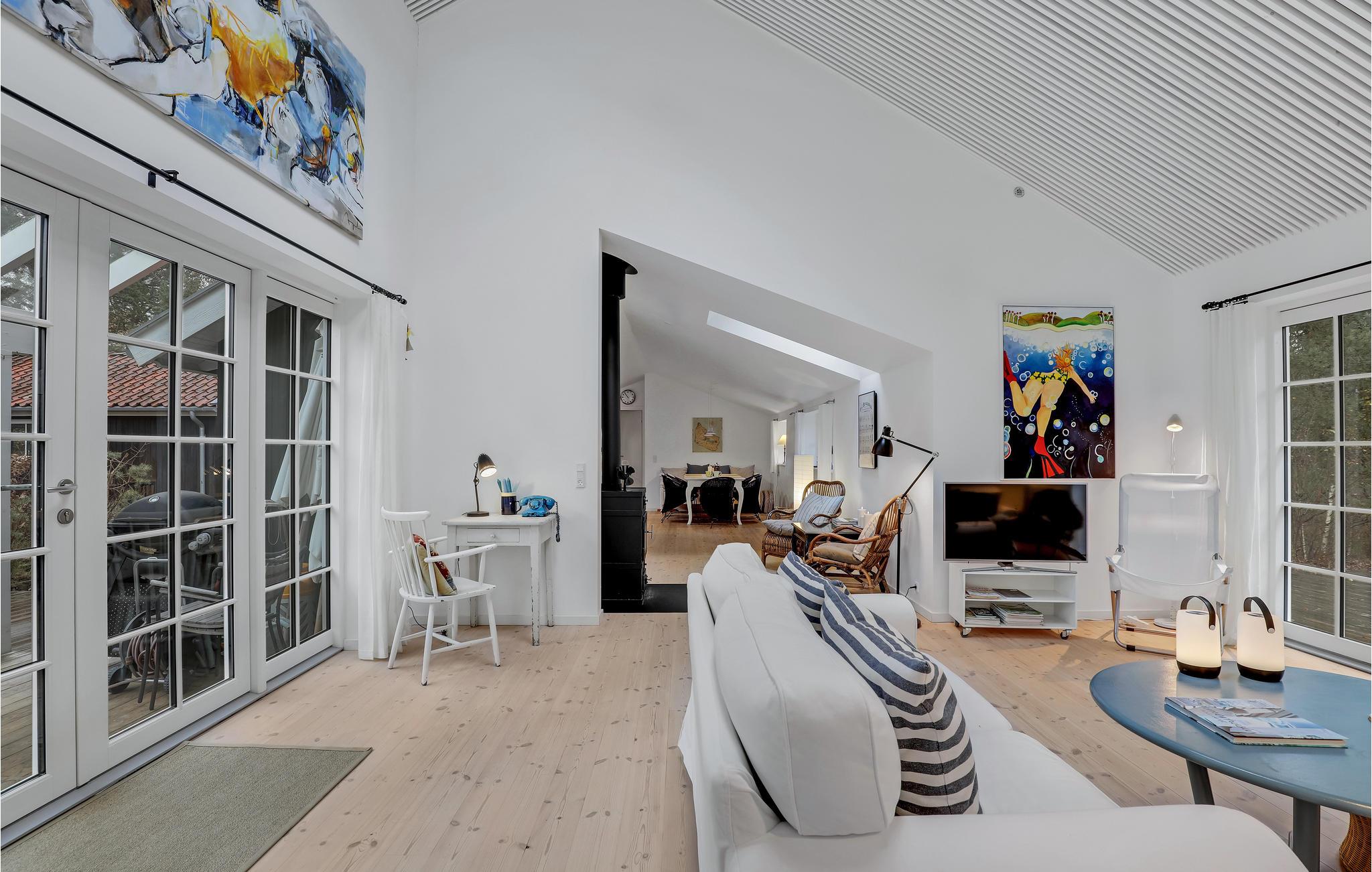 Velkommen til det lyse sommerhushus, hvor I kan tilbringe en dejlig ferie sammen. Den hyggelige og moderne indretning gør det til et behageligt sted, hvor I kan slappe af og lægge den hektiske hverdag bag jer. Nyd måltider sammen og afslappede aftener i opholdsstuen med en smuk udsigt over haven gennem store sprossevinduer. Her kan I tage plads i de rummelige sofaer, se en film sammen, eller bare hyggesnakke og lægge planer for næste dag, mens flammerne knitrer i brændeovnen. Tilbered lækre retter på grillen til hele familien på terrassen og benyt lejligheden til at tilbringe hyggelige timer sammen udendørs. Der er en gynge til jeres børn på ejendommen.