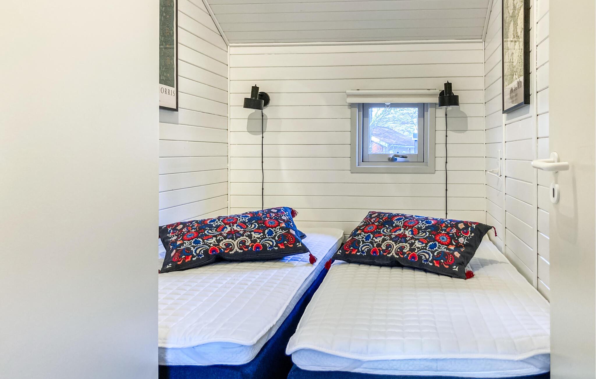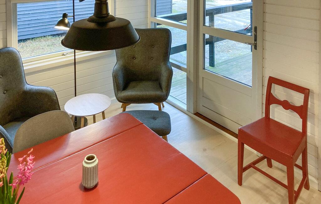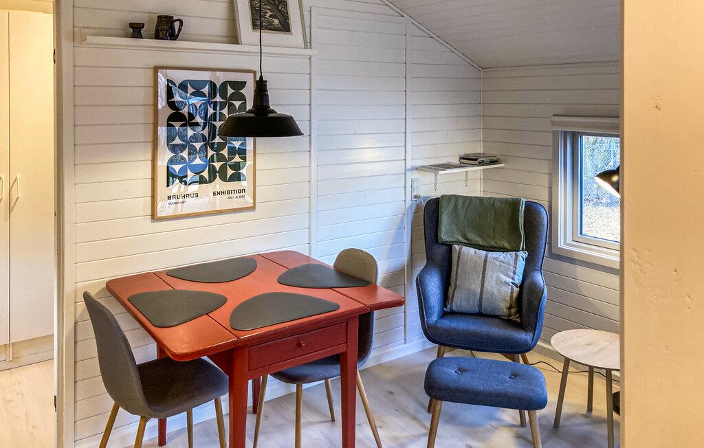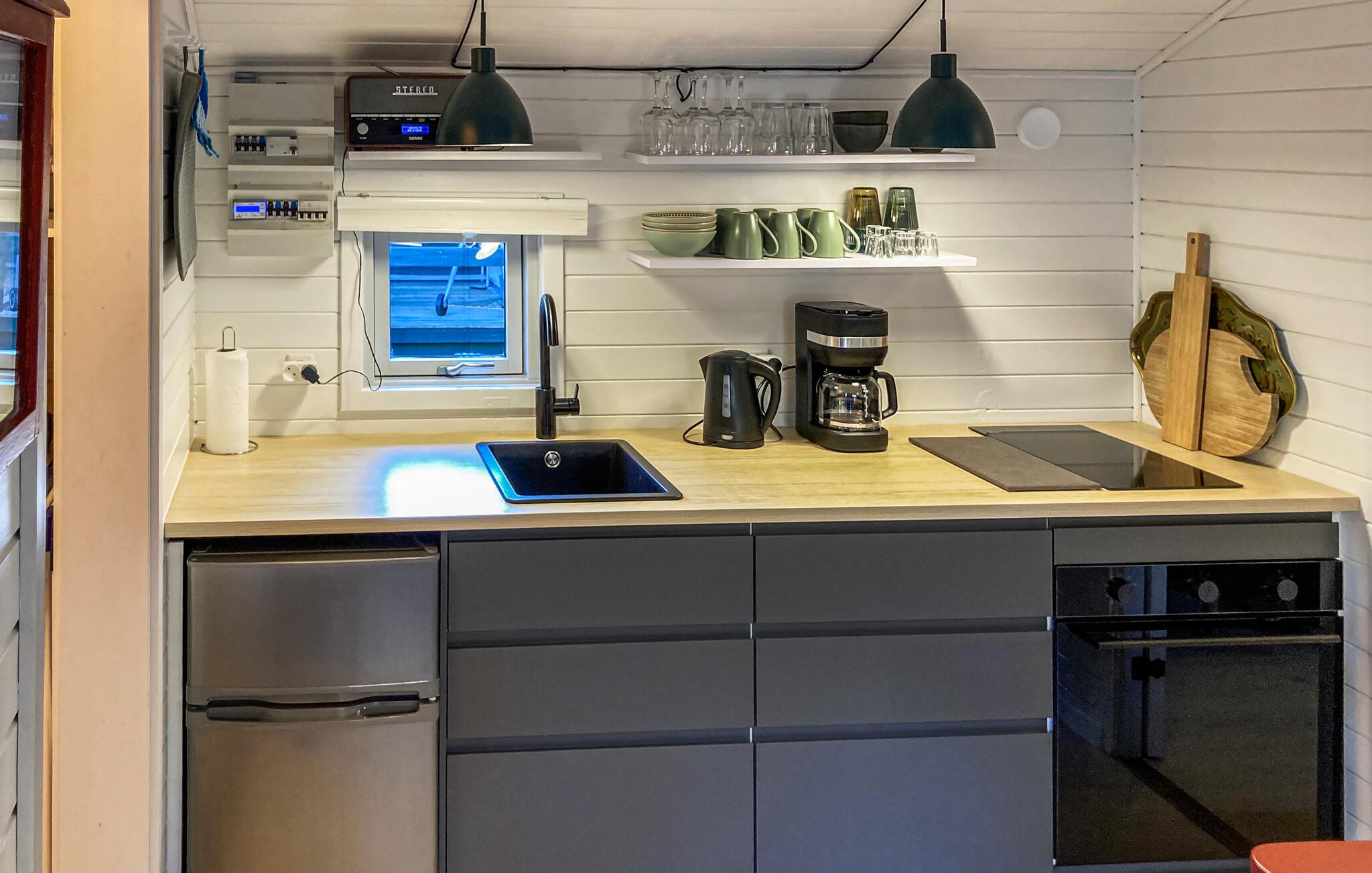 Velkommen til dette moderne feriehus, hvor I hurtigt glemmer alt om den travle hverdag. Farveskalaen er rolig og skandinavisk, og rummene er godt indrettet. I det lille køkken kan I nemt gøre feriens retter klar, og opholdsrummet giver jer en god ramme om måltiderne og aftenhyggen.