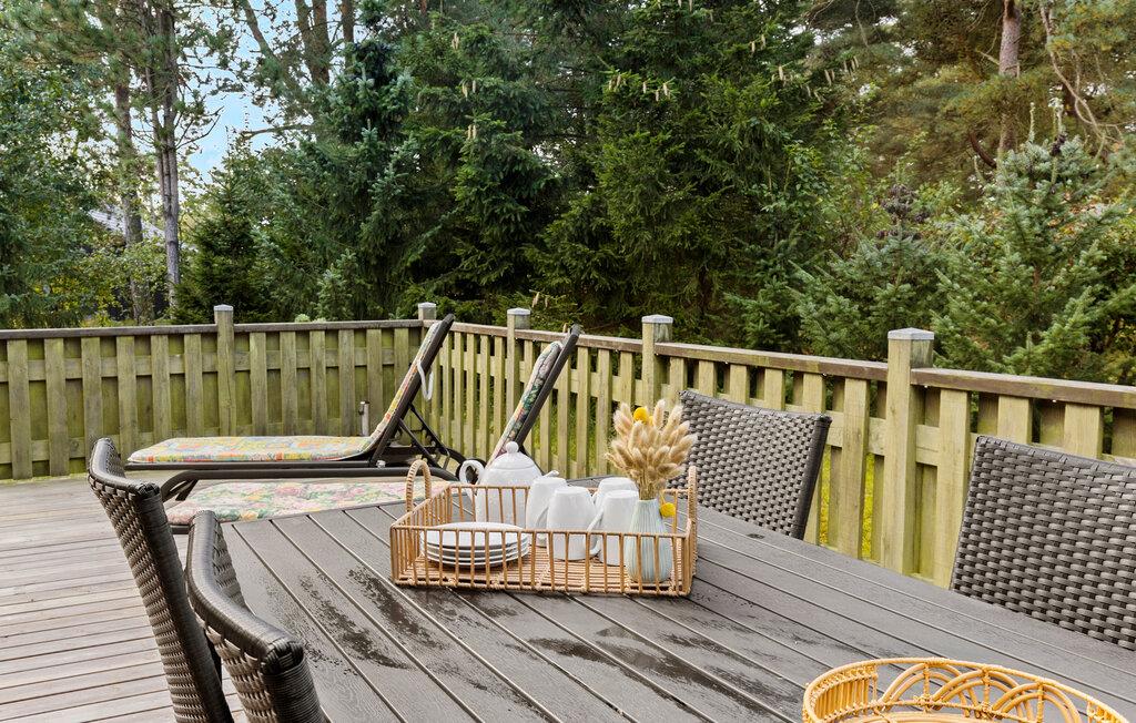 I sommermånederne bliver den rummelige terrasse jeres anden stue. Herfra kan I iagttage børnene spæne rundt på plænen eller lave akrobatik på trampolinen.