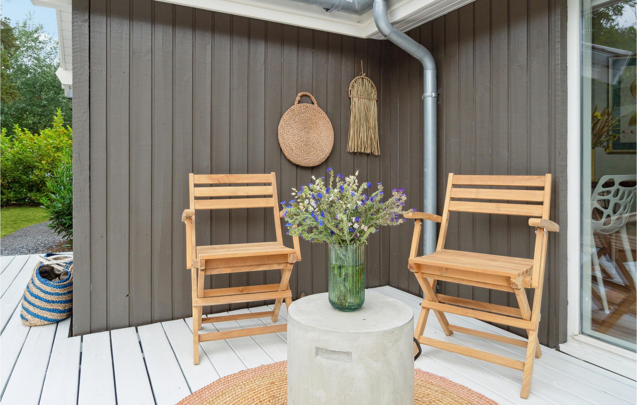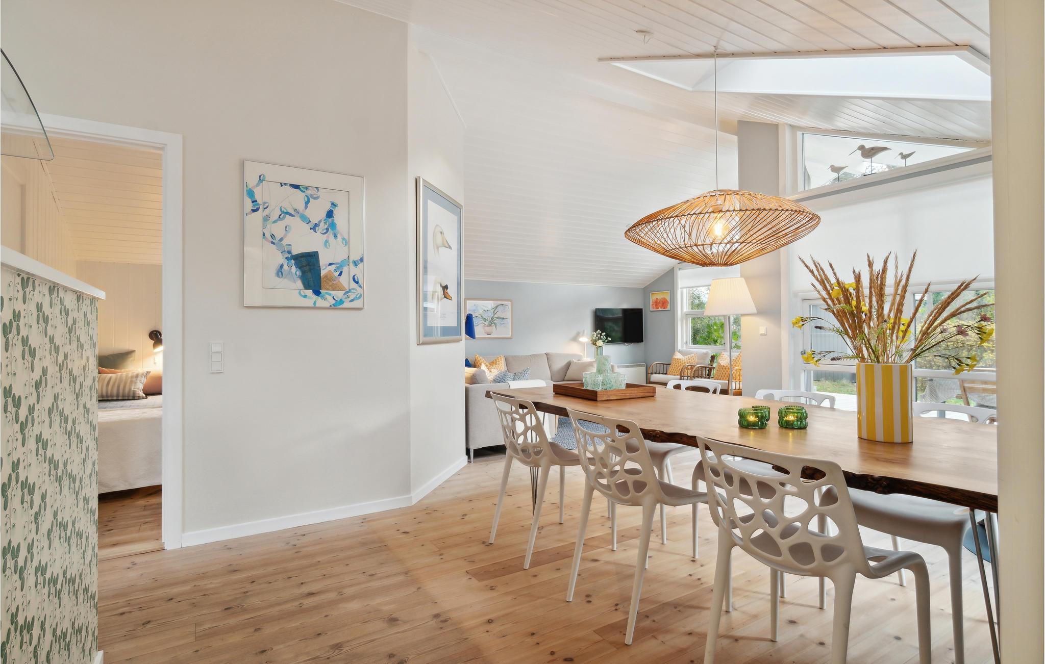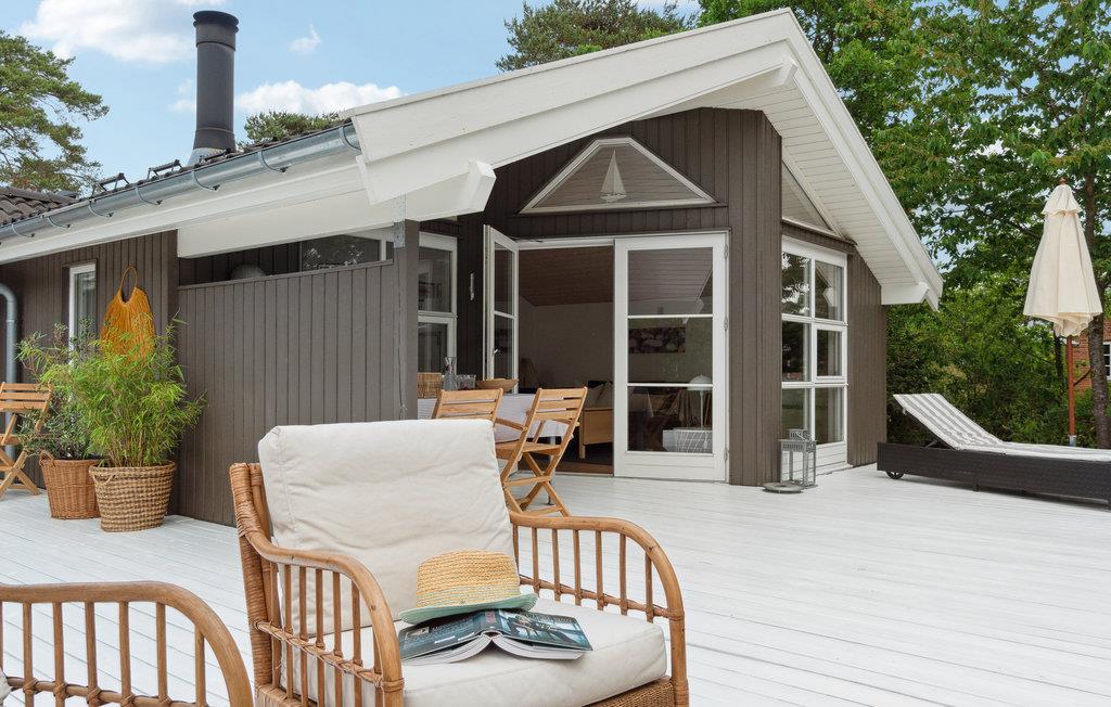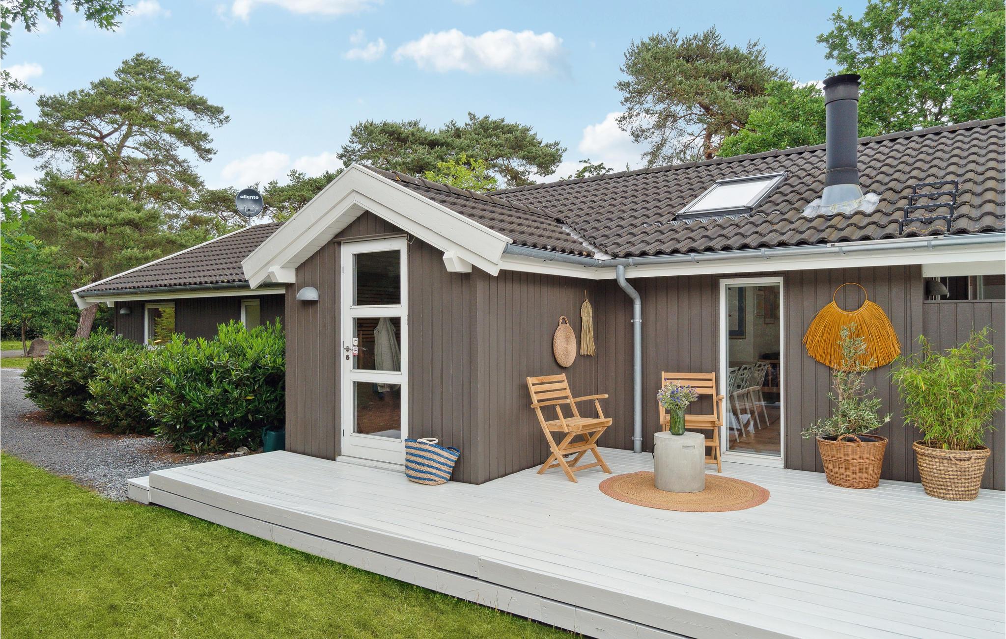Velkommen til dette smagfulde feriehus med stor terrasse nær sandstranden.