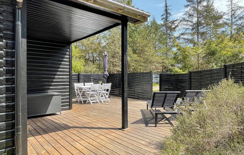 Hyggeligt træhus tæt på Balka Strand med delvist overdækket terrasse og brændeovn for en afslappende ferie.
