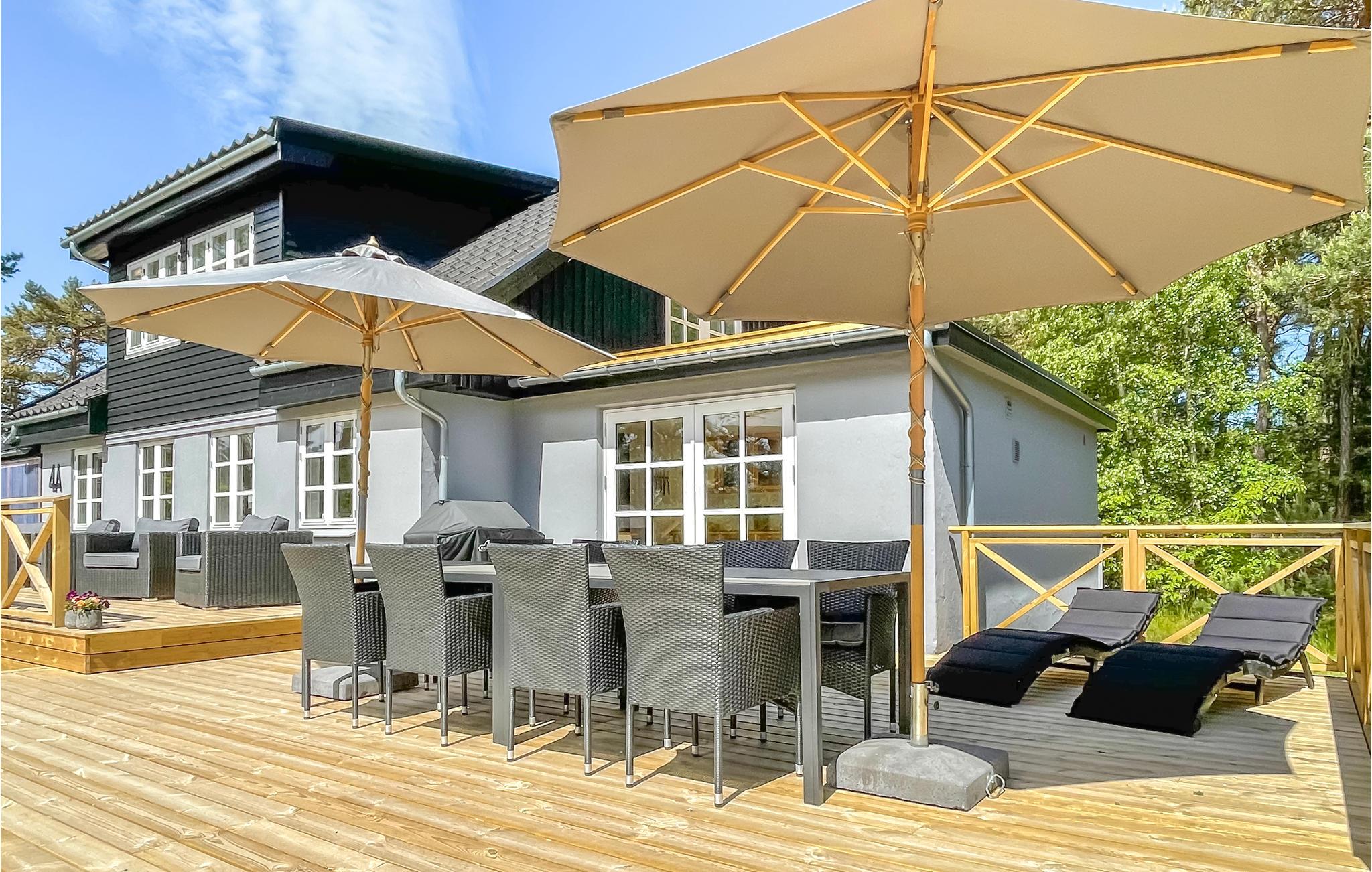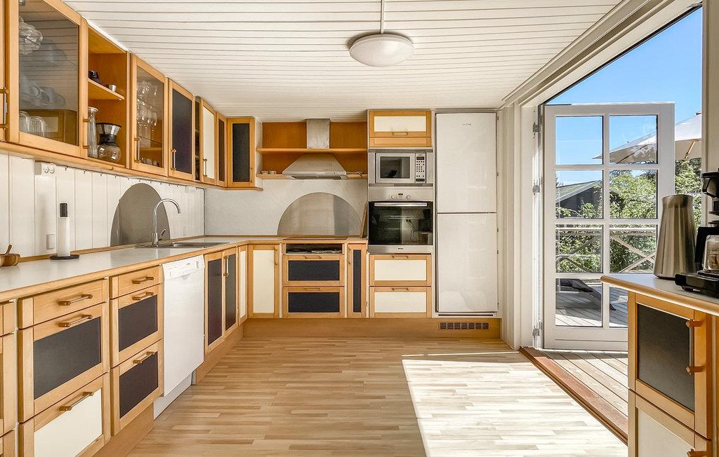 Der er lagt op til nogle skønne dage i dette sommerhus, som er flot og moderne indrettet. Smid en knude i brændeovnen på en kølig dag eller læg jer til rette med en god bog på en fatboy i læsekrogen. I det rummelige køkken er der plads til de store armbevægelser, og når salaten er blandet og kødet marineret, kan I træde direkte ud på en stor og solrig træterrasse med havemøbler og gasgrill. Ud over soveværelset i stueplan kan I se frem til en flot 1. sal med gæstetoilet og tre soveværelser, det ene med udgang til en pragtfuld træterrasse, hvor morgensolen kan nydes i fulde drag med en kop kaffe i hånden.