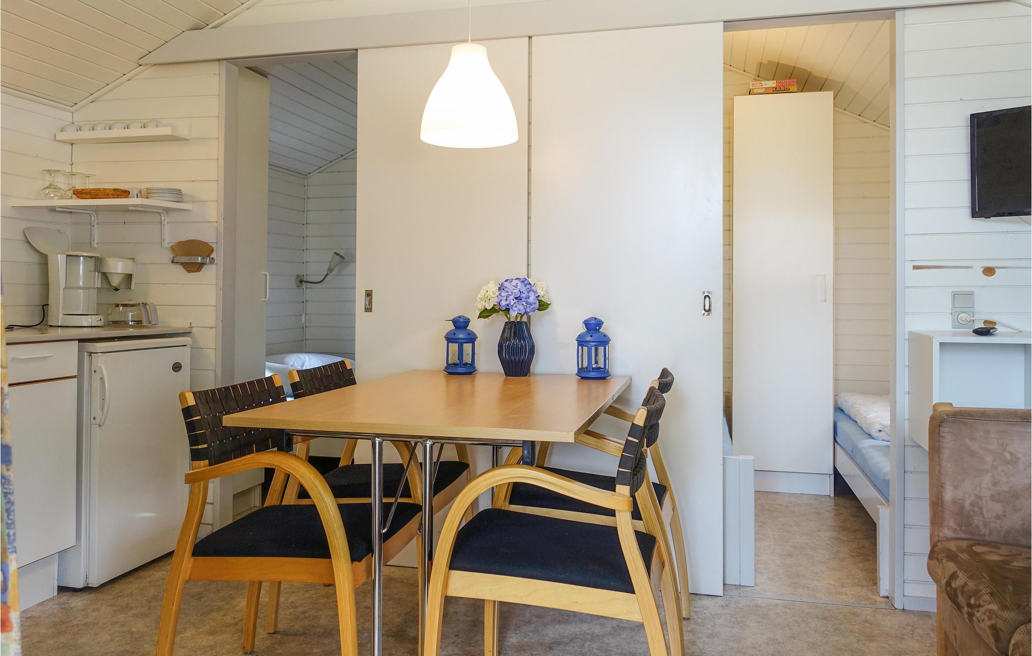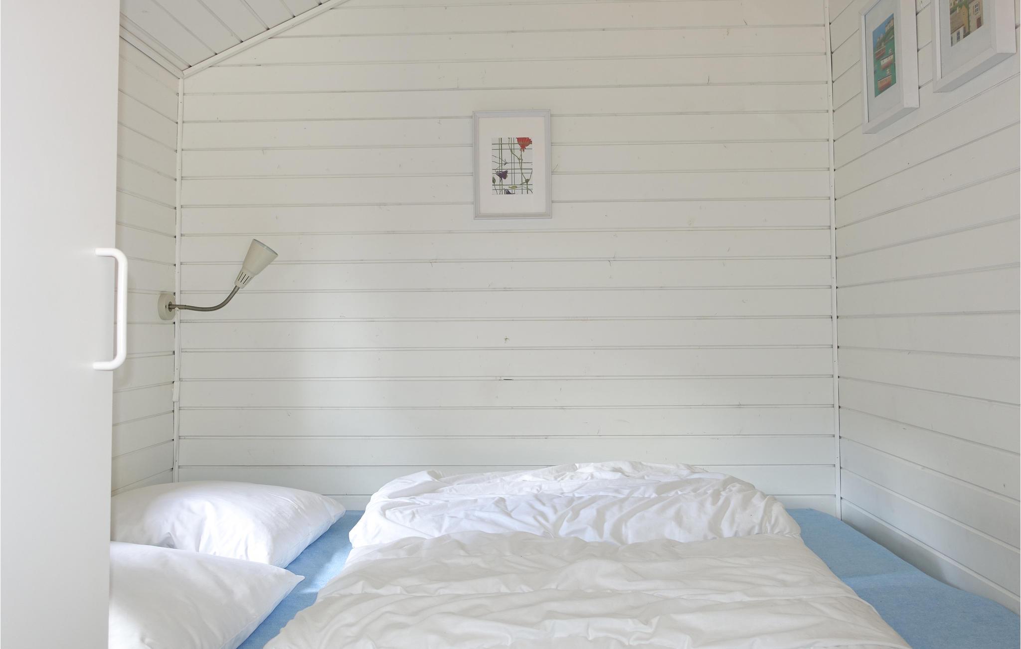 Hytten er velindrettet med plads til fire personer. Der venter et hjemligt interiør i skandinavisk stil med tekøkken. Tag en kop kaffe og sæt jer i det hyggelige opholdsrum eller find en stol på den solrige terrasse. Sovepladserne fordeler sig over en dobbeltseng og to enkeltsenge.